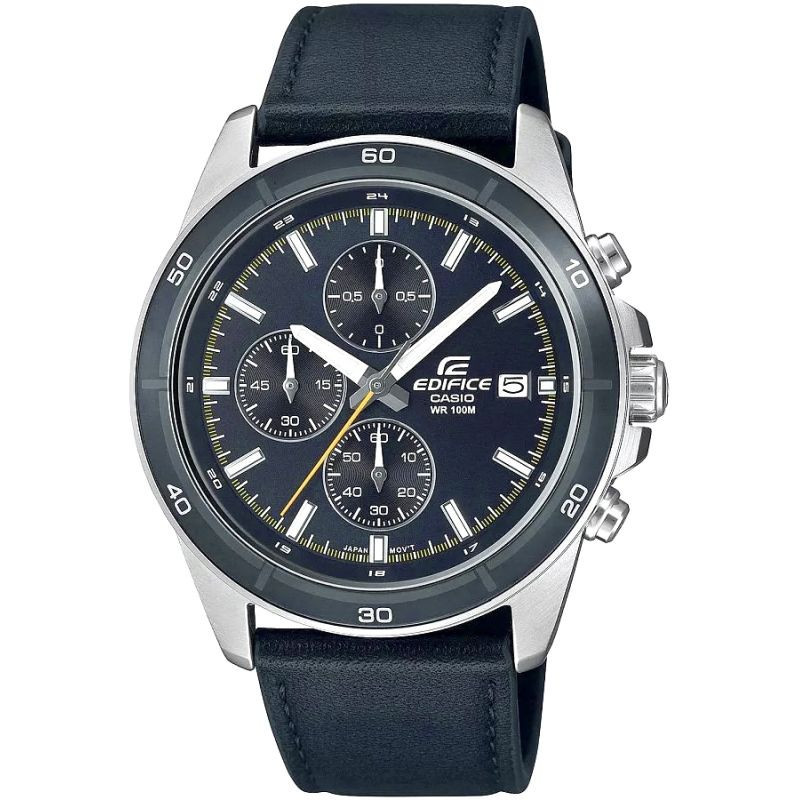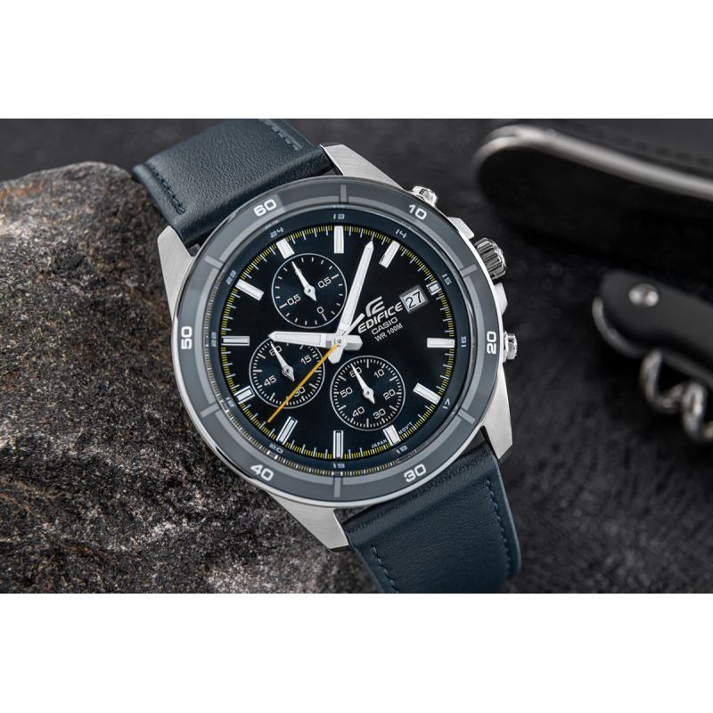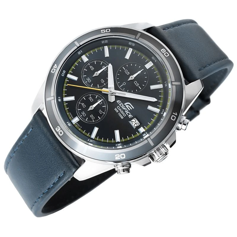 Vyberte si dokonalou kombinaci stylu a funkčnosti s klasickým chronografem EDIFICE střední velikosti. Řemínek z pravé kůže dokonale ladí s tmavě šedým ciferníkem, inspirovaným městským dynamickým stylem. Model je vybaven funkcí data dne v měsíci a chronografy: stopky 1/10 sekundy, vteřinová ručička, minutová ručička. Díky vodotěsnosti 10 BAR si je můžete bez obav vzít k bazénu, na trénink nebo za vodním dobrodružstvím. Díky fluorescenčnímu podsvícení budete mít čas plně pod kontrolou i po setmění.