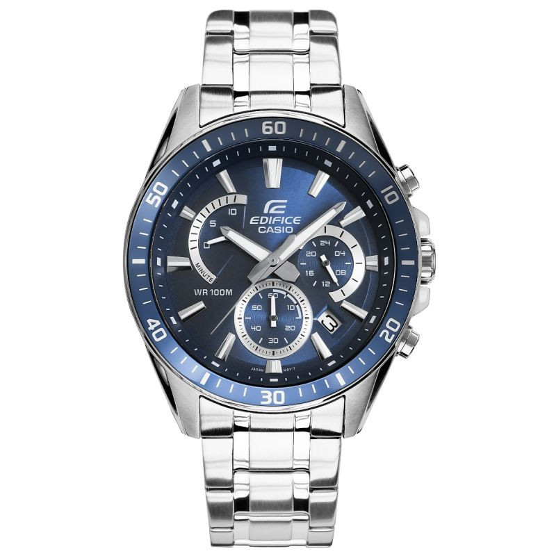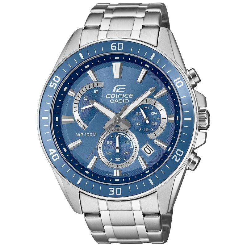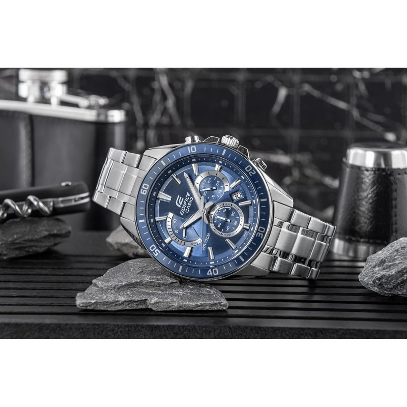 Velký standardní chronograf EDIFICE s retrográdním ciferníkem na pozici 10 hodin. luneta, indexy, ručičky a část pomocného ciferníku byly provedeny ve sportovním odstínu modré barvy, což hodinkám dodává dynamický a moderní vzhled. hodinky jsou vybaveny funkcí data pro dny v měsíci a chronografy:stopky vteřin, minut a chronograf 24h. díky vodotěsnosti 10 BAR si je můžete bez obav vzít do bazénu, na trénink nebo za vodním dobrodružstvím a díky fluorescenčnímu podsvícení budete mít čas plně pod kontrolou i po setmění.