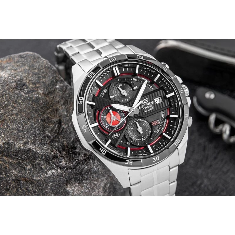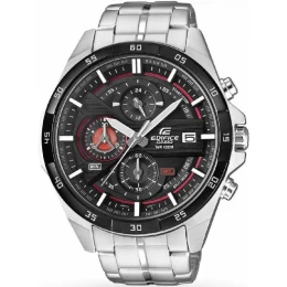 Velký standardní chronograf EDIFICE, jehož hlavním rysem je dynamický design dvouvrstvého trojrozměrného ciferníku. Kombinace černé barvy s červenými kovovými detaily na ciferníku dodává hodinkám elegantní a zároveň sportovní vzhled. Hodinky jsou vybaveny funkcemi dne v měsíci a chronografy:stopky vteřin, minut a chronograf 24 h. Díky vodotěsnosti 10 BAR si je můžete bez obav vzít do bazénu, na trénink nebo za vodním dobrodružstvím a fluorescenční podsvícení vám umožní plnou kontrolu času i ve tmě.