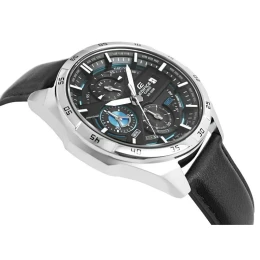 Duży, standardowy chronograf EDIFICE. Jego główną cechą jest dynamiczny design dwuwarstwowej, trójwymiarowej tarczy. Połączenie czerni z niebieskimi metalicznymi detalami na tarczy nadaje zegarkowi elegancki, a jednocześnie sportowy charakter. Wyposażony w funkcjędaty dni miesiąca oraz chronografy:stoper sekund, minut oraz chronograf 24h. Dzięki wodoszczelności 10 BAR możesz śmiało zabrać go na basen, trening czy wodną przygodę, a fluorescencyjne podświetlenie sprawia, że nawet po zmroku masz pełną kontrolę nad czasem.