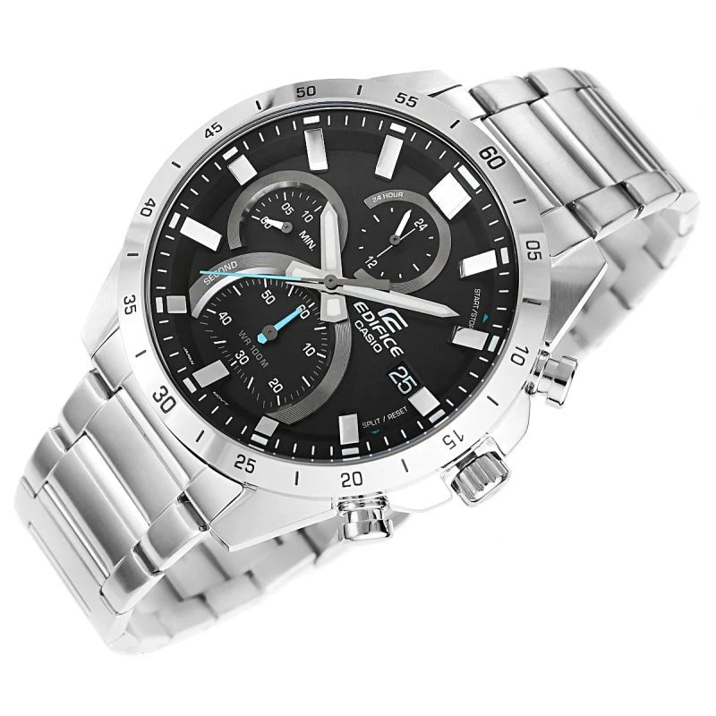 Velký standardní chronograf EDIFICE s výrazným dynamickým vzhledem. Silné trojrozměrné indexy a vnitřní ciferník zdůrazňují sportovní charakter hodinek. Retrográdní ciferník umístěný na levé straně (na pozici 9 hodin) se pohybuje ve tvaru vějíře společně s minutovou ručičkou stopek a každých 10 minut se vynuluje, což zajišťuje plynulé a přesné měření času. Díky vodotěsnosti 10 BAR si je můžete bez obav vzít do bazénu, na trénink nebo za vodním dobrodružstvím a díky fluorescenčnímu podsvícení budete mít čas plně pod kontrolou i po setmění.
