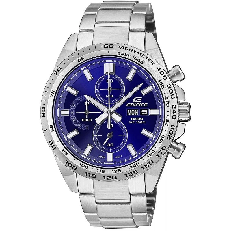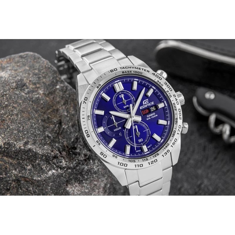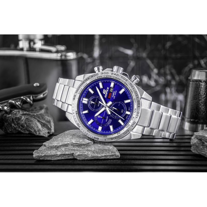 Rozhodněte se pro dynamický, odvážný styl s tímto klasickým chronografem EDIFICE navrženým se sportovním nádechem. Efektně zpracovaný tmavě modrý ciferník dodává hodinkám výrazný charakter. Ukazatel dne a data dodává hodinkám praktičnost, takže jsou nejen stylové, ale také funkční pro každodenní použití. Díky vodotěsnosti 10 BAR si je můžete bez obav vzít k bazénu, na trénink nebo za vodním dobrodružstvím a díky fluorescenčním prvkům budete mít plnou kontrolu nad časem i po setmění.