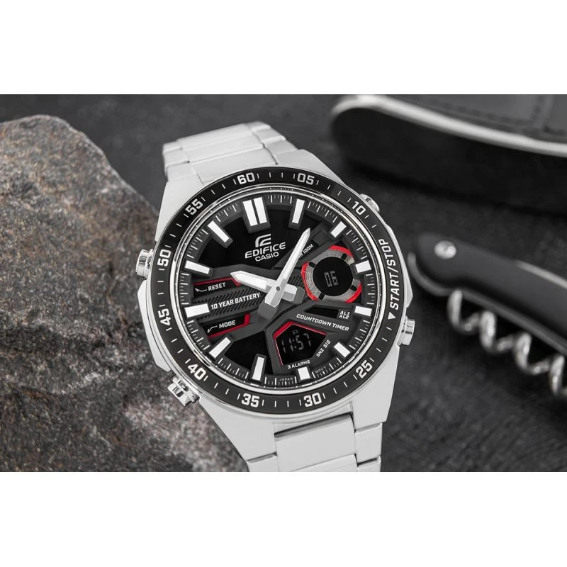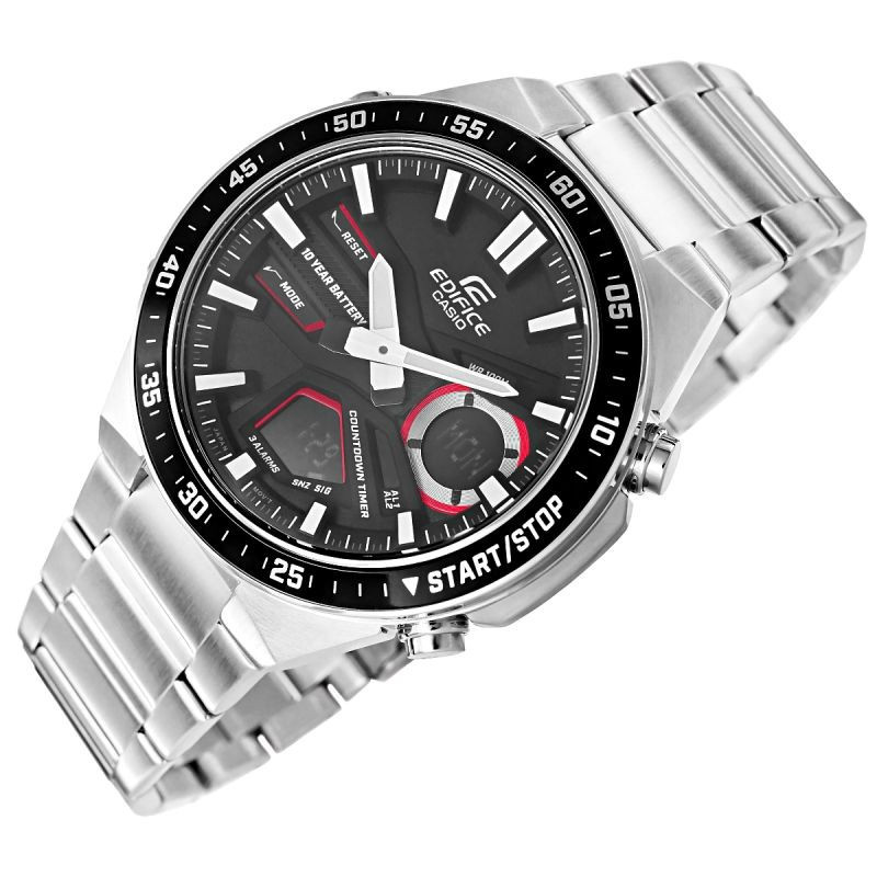 Všestranné hodinkypro aktivní a náročné. Analogově-digitální hodinky EDIFICE EFV-C110 poskytují přesnost a funkčnost po dlouhá léta - díky desetileté baterii můžete na dlouhou dobu zapomenout na jejich výměnu. Dynamický, sportovní design podtrhuje hloubka a trojrozměrnost ciferníku, zatímco digitální displeje nabízejí širokou škálu funkcí, včetně světového času, stopek na 1/100 sekundy a odpočítávacího časovače. Model je také vybaven funkcíTelememos možností uložení 30 telefonníchčísel obsahujících až 12 číslic se jménem o délce až 8 znaků. Soustřeďte se na život a vyberte si hodinky EDIFICE EFV-C110 - hodinky, které vás nezklamou.