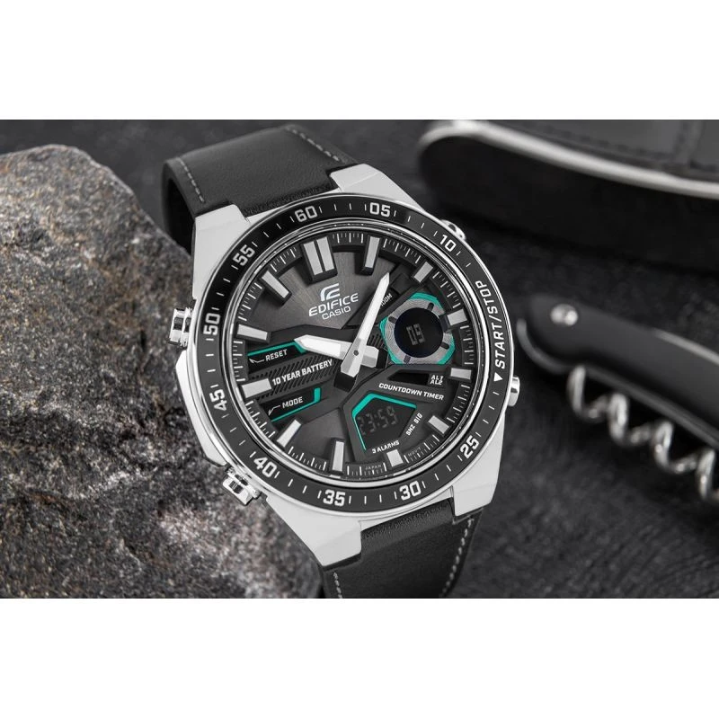 Všestranné hodinkypro aktivní a náročné. Analogově-digitální hodinky EDIFICE EFV-C110 poskytují přesnost a funkčnost po dlouhá léta - díky desetileté baterii můžete na dlouhou dobu zapomenout na jejich výměnu. Dynamický, sportovní design podtrhuje hloubka a trojrozměrnost ciferníku, zatímco digitální displeje nabízejí širokou škálu funkcí, včetně světového času, stopek na 1/100 sekundy a odpočítávacího časovače. Model je také vybaven funkcíTelememos možností uložení 30 telefonníchčísel obsahujících až 12 číslic se jménem o délce až 8 znaků. Soustřeďte se na život a vyberte si hodinky EDIFICE EFV-C110 - hodinky, které vás nezklamou.