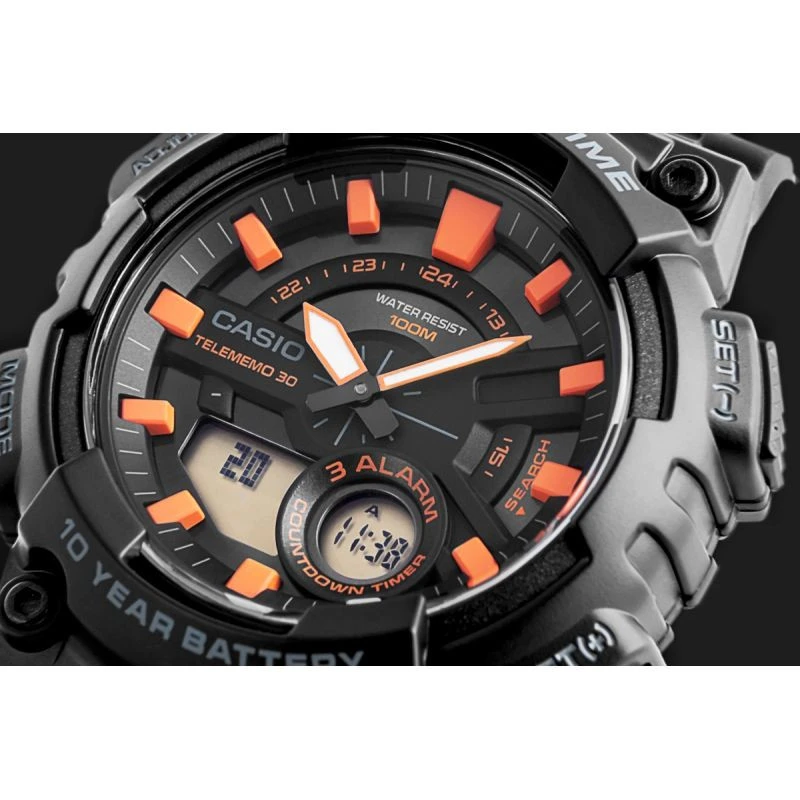 Hodinky Casio AEQ-110W s výrazným kovovým 3D ciferníkem a prvky v oranžové barvě jsou stejně dobře použitelné při každodenním běhu městem i v přírodě - na výletě za město nebo na víkendové výpravě za přežitím. tento model nepotřebuje žádné slevy - byl vytvořen pro ty, kteří očekávají, že zařízení bude fungovat kdykoli a kdekoli. 10 let klidu na jednu baterii, vodotěsnost 100 metrů (10 BAR) a navíc funkce, které se opravdu hodí: světový čas ve 30 městech (29 časových pásem),stopky na 1/100 sekundy pro speciální úkoly, 3 denní alarmy , aby vám nic neuniklo, a Telememo 30 - abyste měli důležité kontakty po ruce i bez přístupu k telefonu. toto jsou hodinky, které nejen vypadají konkrétně - ony prostě konkrétní jsou.