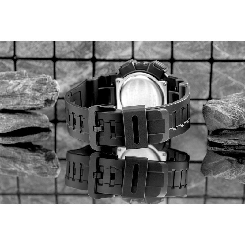 Wystające, przestrzenne indeksy w intensywnym w kolorze nie tylko świetnie kontrastują z matową czernią, ale przede wszystkim dodają tarczy głębi i charakteru. Każdy detal, od wyraźnie zarysowanych wskazówek po strukturę pierścienia, podkreśla dynamiczny i nowoczesny styl zegarka, który łączy czytelność z surowym, outdoorowym pazurem.