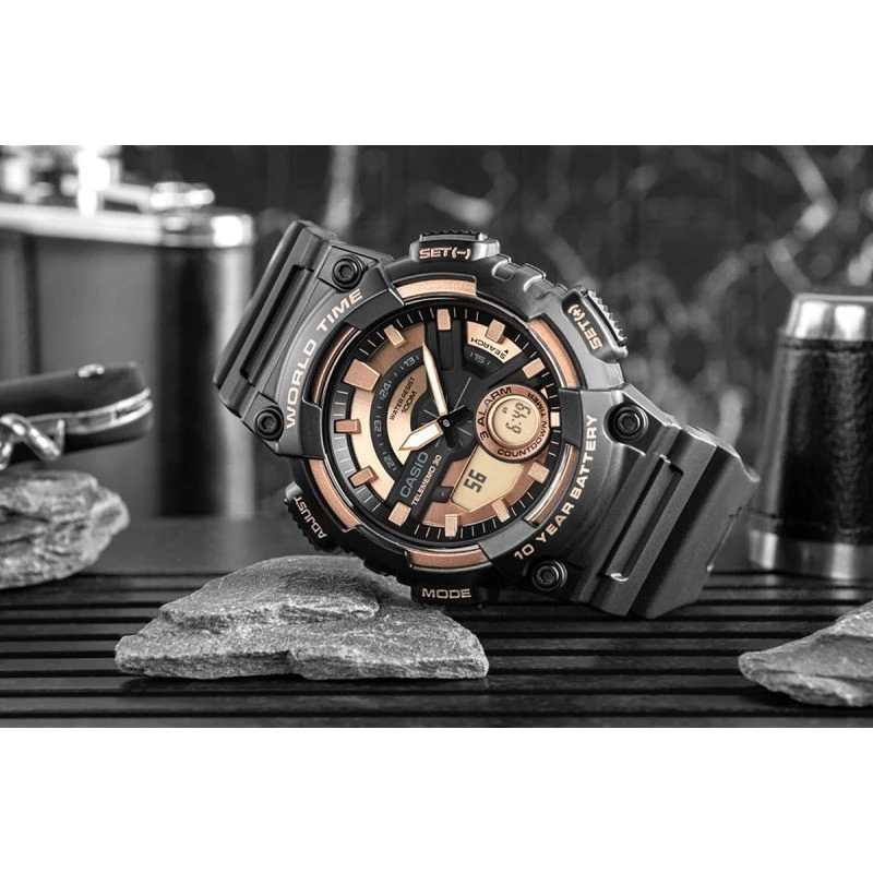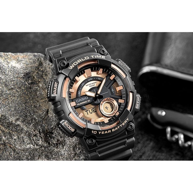Model Casio AEQ-110W z wyrazistą metaliczną tarczą 3D i elementami w kolorze miedziano-złotym sprawdza się zarówno w codziennym biegu po mieście, jak i w terenie – podczas wypadu za miasto czy weekendowego survivalu. Ten model nie potrzebuje taryfy ulgowej – został stworzony dla tych, którzy oczekują, że sprzęt będzie działać zawsze i wszędzie. 10 lat spokoju na jednej baterii, wodoszczelność 100 metrów (10 BAR), a do tego funkcje, które naprawdę się przydają: czas światowy w 30 miastach (29 stref czasowych),stoper 1/100 sekundy do zadań specjalnych, 3 alarmy dzienne, żeby nic Ci nie umknęło, i Telememo 30 – byś miał ważne kontakty pod ręką, nawet bez dostępu do telefonu.To zegarek, który nie tylko wygląda konkretnie – on po prostu jest konkretny.