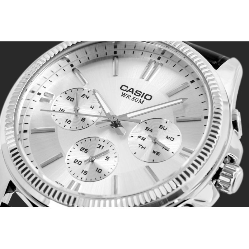 CASIO MTP-1375L-1AVDF jsou hodinky pro muže, který má rád vše pod kontrolou - styl, čas i kvalitu. Stříbrný ciferník s jemným hloubkovým efektem a stříbrnými detaily se dokonale snoubí s černým koženým řemínkem a vytváří stylové duo - ideální ke košili i ležérnějšímu outfitu. Dílčí ciferníky zobrazující den v týdnu, datum a čas ve 24hodinovém režimu vám poskytnou kompletní přehled na první pohled, aniž byste museli sahat po telefonu. Vodotěsnost do 50 metrů a přesnost strojku (±20 sekund/měsíc) znamená klid - nemusíte se bát počasí, náhodného postříkání nebo zpoždění. Celek vytváří výrazně mužný styl, který zaujme na první pohled a díky kterému hodinky výrazně převyšují svou cenovou třídu.