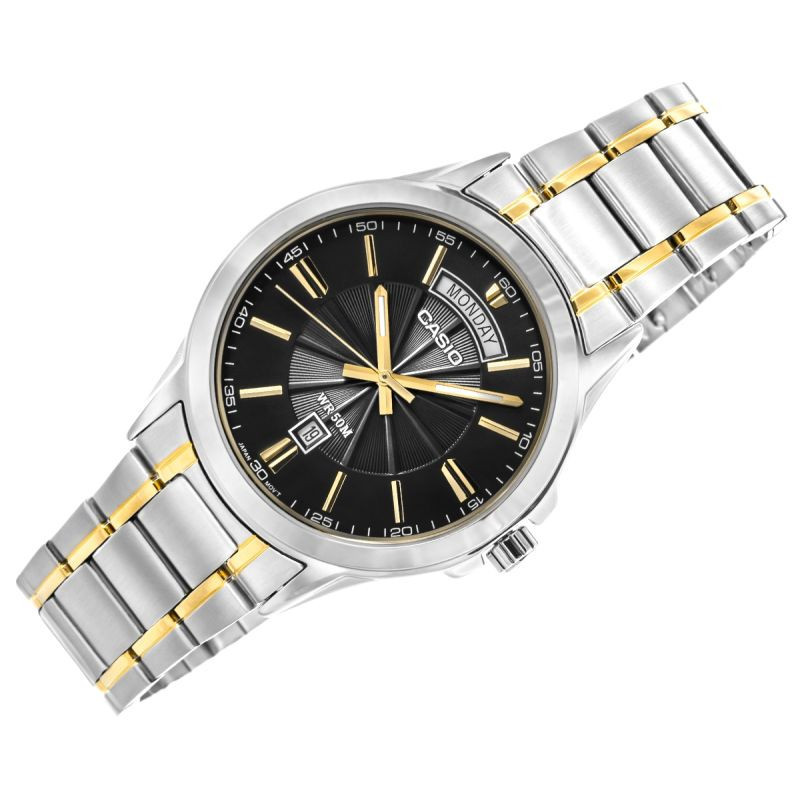 Casio MTP-1381G-1AVDF jsou hodinky pro muže, který ocení klasiku, ale nebojí se výrazných akcentů. Ocelové pouzdro a náramek v elegantním dvoubarevném provedení (stříbrná + zlatá) obklopují sytě černý ciferník s texturovanou povrchovou úpravou, která celku dodává hloubku. Tento model nejenže vypadá jedinečně - nabízí také praktické funkce: datumovka a ukazatel dne v týdnu byly diskrétně integrovány do uspořádání ciferníku, čímž byla zachována jeho estetická harmonie. Fluorescenční ručičky zajišťují čitelnost po setmění a vodotěsnost do 50M zaručuje volnost při každodenním používání.