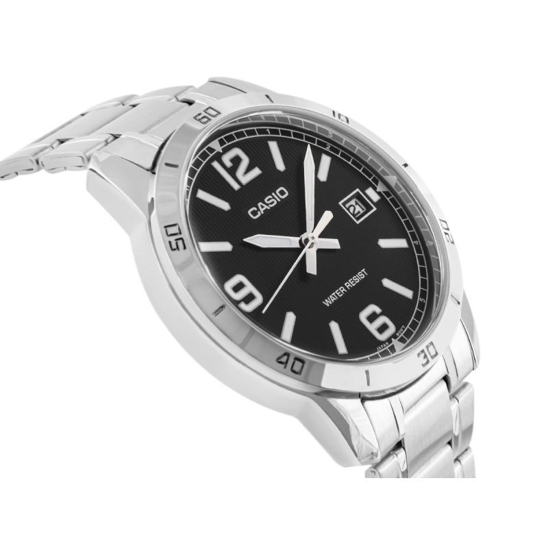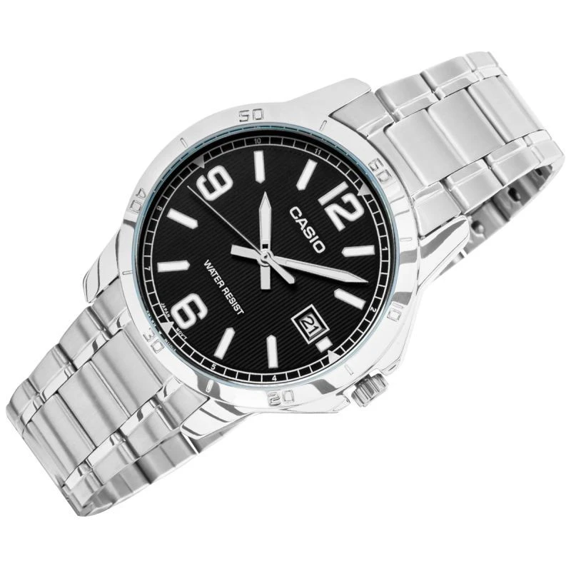 Pánskýmodel z kolekce CASIO s klasickým 40milimetrovým pouzdrem z nerezové oceli a snadno čitelným ciferníkem s jemnou vertikální strukturou, která mu dodává hloubku. Výrazné indexy hodin, velké arabské číslice a další minutová stupnice na vnitřním rámečku zaručují skvělou čitelnost a usnadňují orientaci v čase. Funkční datumovka umístěná na 3. hodině umožňuje rychlé zobrazení aktuálního dne v měsíci, zatímco vodotěsnost na úrovni WR zaručuje bezpečné používání v každodenních situacích. Díky náramku znerezové oceli s matným povrchem získávají hodinky elegantní charakter, který se hodí jak k obleku, tak k ležérnějšímu, městskému stylu. Quartzový strojek zajišťuje přesnost a spolehlivost, kterými je značka Casio proslulá.