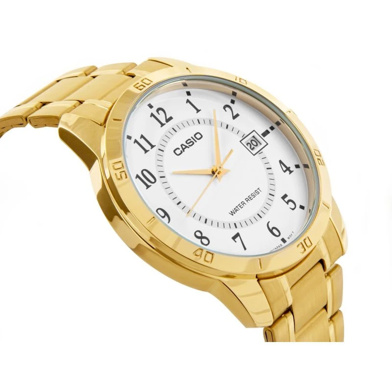 Pánský model z kolekce CASIO, který se vyznačuje klasickým 40milimetrovým pouzdrem a náramkem z nerezové oceli, potaženým odolnou vrstvou zlatých iontů. světlý ciferník s přehlednými černými arabskými číslicemi zajišťuje vynikající čitelnost, zatímco dodatečná minutová stupnice ve vnitřním kroužku usnadňuje orientaci v čase. praktická datumovka umístěná na 3. hodině poskytuje rychlý přehled o aktuálním dni v měsíci. vodotěsnost na úrovni WR (Water Resist) znamená, že hodinky lze bez obav nosit každý den - například při mytí rukou nebo za deštivého počasí. hodinky pohání přesný quartzový strojek, který zaručuje spolehlivý chod.