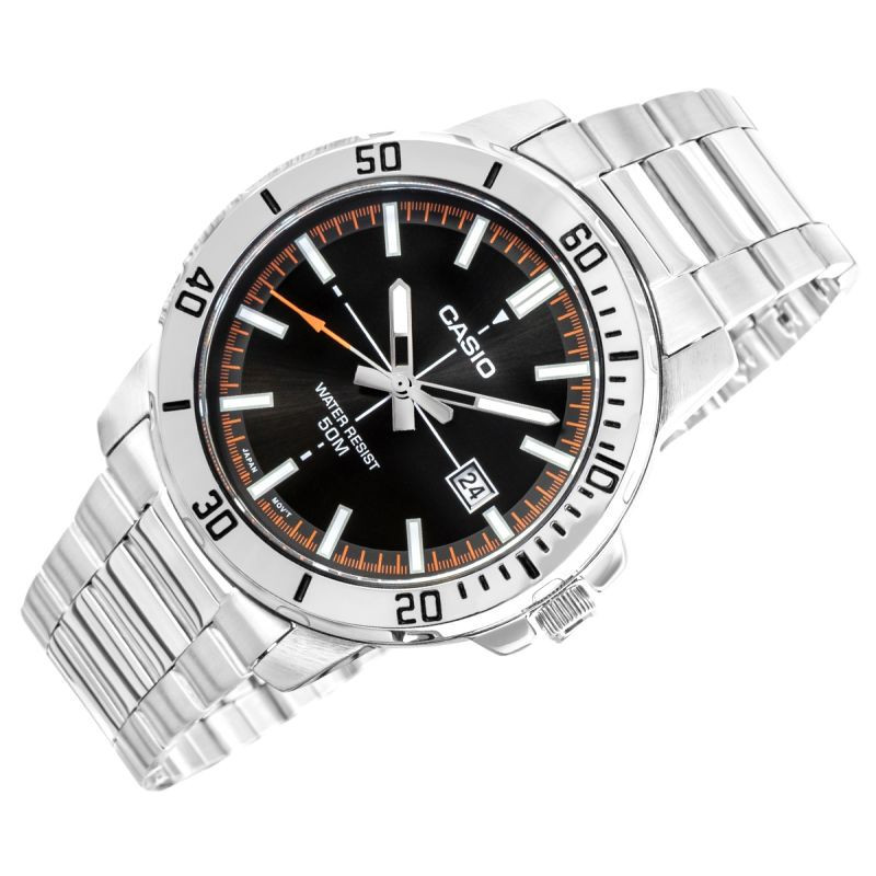 Klasický model CASIO, který vyniká robustním 44milimetrovým pouzdrem z nerezové oceli a černým ciferníkem s dynamickými oranžovými akcenty, které mu dodávají energický, mužný charakter.Přehledné indexy a pevné ručičky zajišťují dokonalou čitelnost v každé situaci - od ranního běhu až po pozdní obchodní schůzku.Praktická datumovka na 3. hodině a vodotěsnost 50M činí z těchto hodinek ideální volbu pro každý den - bez ohledu na počasí a životní styl.Díky ocelovému náramku s klasickým trojitým zapínáním spojuje tento model eleganci s každodenní funkčností.Hodinky poháněné přesným quartzovým strojkem jsou vhodné pro muže, kteří oceňují praktičnost, odolnost a moderní vzhled.