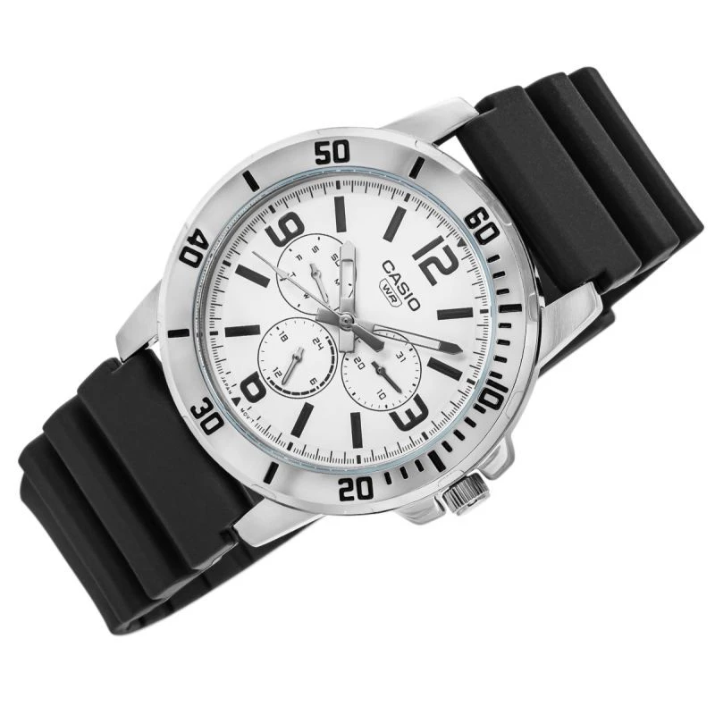 Casio MTP-VD300-7BUDF jsou klasické pánské hodinky, které v sobě spojují eleganci a funkčnost v tom nejlepším světle. Snadno čitelný bílý ciferník se třemi decentně umístěnými subciferníky - datum, ukazatel dne v týdnu a 24hodinový čas - zaručuje plnou kontrolu nad každodenním rytmem dne. Ocelové pouzdro a pevný náramek zajišťují odolnost a nadčasový vzhled, který se hodí k obleku i ležérnímu stylu. Minerální sklíčko chrání hodinky před poškrábáním a přesný quartzový strojek zajišťuje spolehlivost v každé situaci. Jedná se o nabídku pro muže, který ocení jednoduchost, styl a praktické řešení v jednom doplňku.