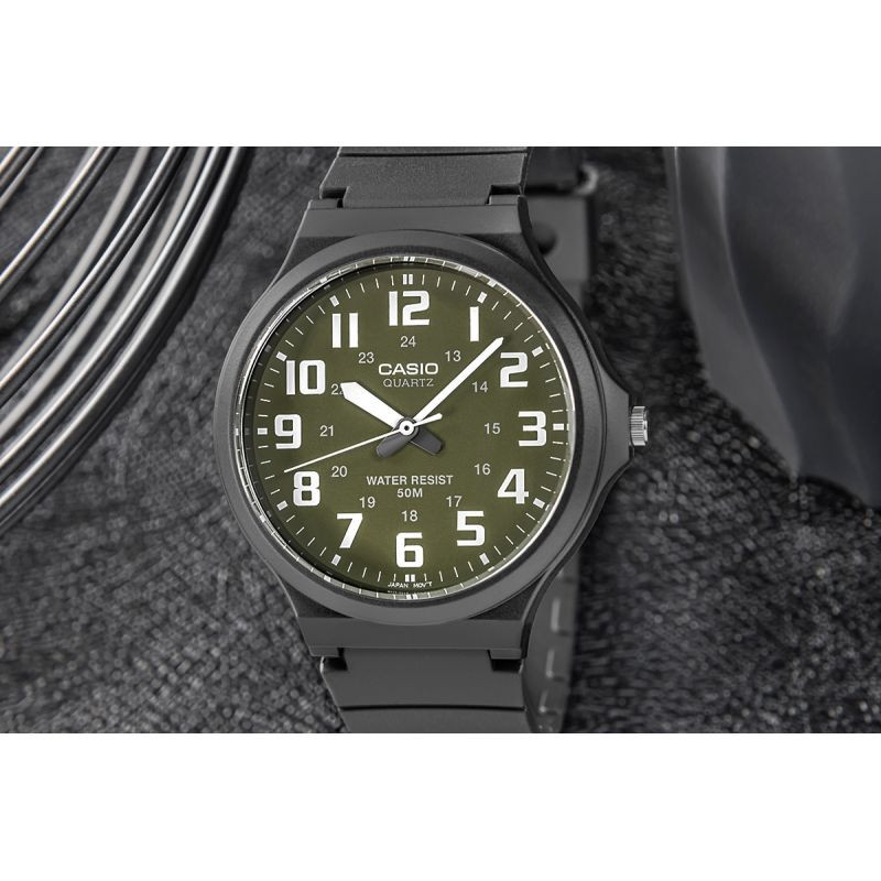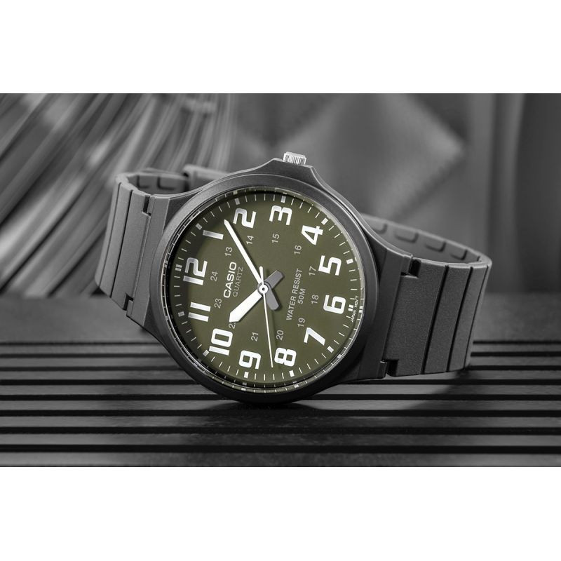 Pánský model hodinek CASIO MW-240 kombinuje minimalismus, funkčnost a pohodlí v mužném designu. Díky lehké konstrukci hodinek (pouhých 35 g!) jsou na zápěstí téměř nepostřehnutelné. Pružný matný řemínek z pryskyřice se přizpůsobí vašim pohybům, je odolný proti opotřebení a připravený na každou situaci - od schůzky až po trénink. Velké kontrastní indexy umožňují okamžitou kontrolu času. Odolné sklíčko z pryskyřice zaručuje odolnost proti každodennímu opotřebení a vodotěsnost 5 BAR zajistí, že stříkající voda, déšť ani rychlá sprcha nebudou problém.