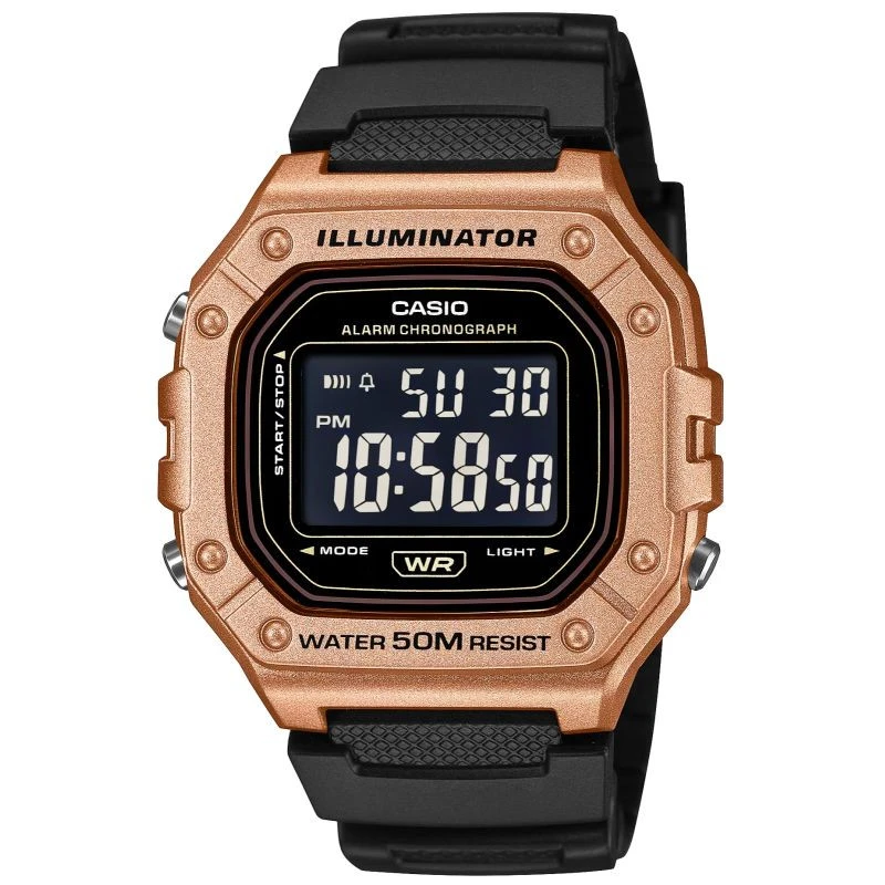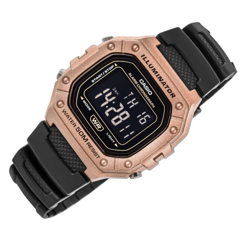 Casio W-218HM-5BVDF to esencja klasycznego stylu Casio w nowoczesnym, sportowym wydaniu: wyrazisty, prostokątny wyświetlacz LCD w solidnej kopercie, czytelny na pierwszy rzut oka, z subtelnymi akcentami, które dodają mu świeżości i uniwersalności. Zegarek został stworzony do codziennego tempa: wodoszczelność 50 m, podświetlenie LED dla pewnego odczytu po zmroku, 7-letnia bateria dla długiej niezawodności, a także praktyczny zestaw funkcji – stoper 1/100 s (do 60 min), alarm dzienny i sygnał pełnej godziny, automatyczny kalendarz oraz format 12/24 h. Lekki i wygodny,zszkiełkiem z tworzywa (Resin Glass) i wytrzymałym paskiem z żywicy, świetnie sprawdzi się zarówno na treningu, jak i w codziennych stylizacjach. Jeśli szukasz bezkompromisowej prostoty połączonej z legendarną trwałością Casio, W-218HM-7AVDF będzie strzałem w dziesiątkę.