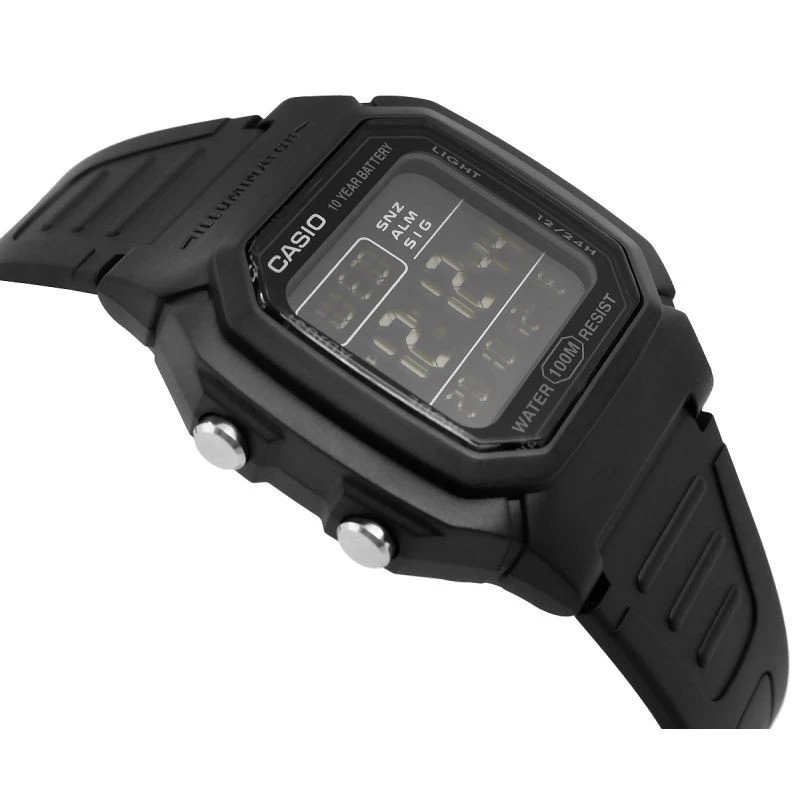 Pánské hodinky Casio W-800H představují spolehlivost v přehlednější podobě - moderní digitální hodinky s velkým displejem, který umožňuje rychlé a snadné čtení času. Hodinky jsou vybaveny vodotěsností do 100 metrů, životností baterie 10 let, LED podsvícením a dalšími funkcemi a nabízejí všechny nejdůležitější informace - čas, datum a den v týdnu - ve velké přehledné podobě. Díky funkcím, jako jsou stopky s přesností na 1/100 sekundy, duální čas a budík s funkcí snooze, se hodí na trénink i na cesty. Odolné LED podsvícení se světelným efektem zajišťuje dobrou viditelnost i po setmění. Robustní konstrukce zajišťuje odolnost v městské džungli i při outdoorových dobrodružstvích.