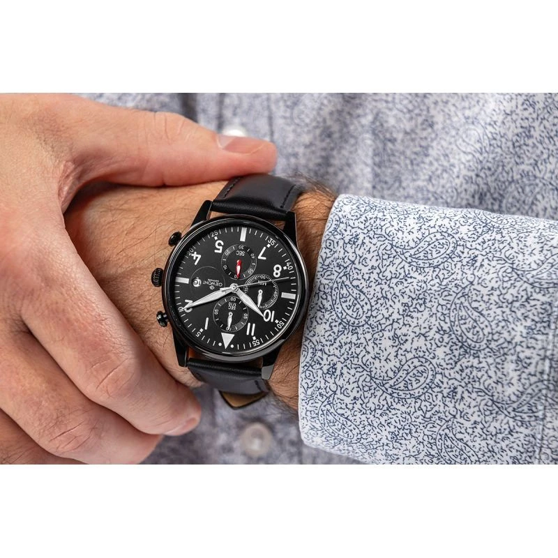 Zegarek Męski Giewont GW5630-A1 to wyjątkowe połączenie lotniczej stylistyki, funkcjonalności oraz zdecydowanego, męskiego charakteru — model stworzony dla osób ceniących wyrazisty design i pełną czytelność w każdych warunkach. Jego tarcza przyciąga uwagę dużymi, kontrastowymi cyframi arabskimi oraz charakterystycznym trójkątnym znacznikiem na godzinie 12, które nadają zegarkowi autentyczny, pilotowy charakter. Trzy precyzyjne subtarcze oferują funkcje chronografu, takie jak pomiar minut, sekund oraz 1/10 sekundy, dodając mu sportowego temperamentu i technicznej głębi. Wytrzymałe szkiełko szafirowe skutecznie chroni tarczę przed zarysowaniami, gwarantując zachowanie idealnego wyglądu przez długi czas, nawet przy intensywnym użytkowaniu. Koperta o eleganckim wykończeniu doskonale komponuje się z miękkim, skórzanym paskiem, który zapewnia komfort i świetne dopasowanie do nadgarstka. Funkcjonalność modelu podkreśla również praktyczny datownik na godzinie 3, zwiększający jego codzienną użyteczność. Zegarek Giewont GW5630-A1 to model dla mężczyzny pewnego siebie, świadomego stylu i ceniącego detale — zegarek, który wyróżnia się z daleka, a z bliska zachwyca głębią i ponadczasową elegancją.