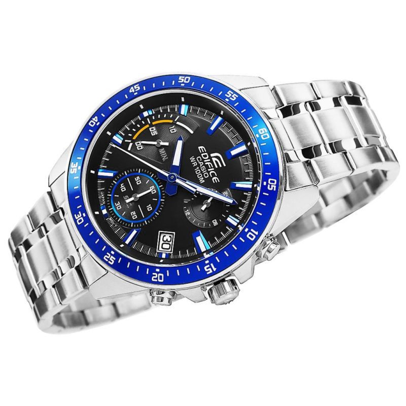 Standardní chronograf EDIFICE střední velikosti s retrogradem umístěným na pozici 10 hodin. Sportovní charakter hodinek podtrhují modré a žluté akcenty, které nápadně kontrastují s černým ciferníkem. Jsou vybaveny funkcí data dnů v měsíci a chronografy: stopkami vteřin, minut a chronografem 24 h. Díky vodotěsnosti 10 BAR si je můžete bez obav vzít do bazénu, na trénink nebo za vodními dobrodružstvími a díky fluorescenčnímu podsvícení budete mít plnou kontrolu nad časem i po setmění.