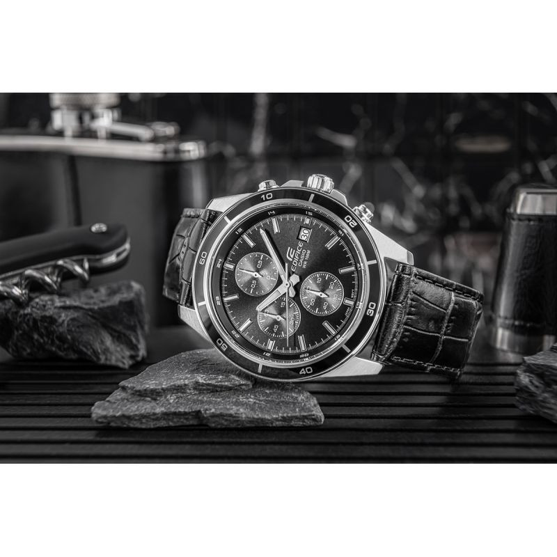 Standardní chronograf EDIFICE střední velikosti. Díky univerzálnímu charakteru hodinek a černému koženému řemínku se celek hodí jak k ležérní, tak sportovní eleganci. Jsou vybaveny funkcemi dne v měsíci a chronografy: stopky na 1/10 sekundy, vteřinová ručička, minutová ručička. Díky vodotěsnosti 10 BAR si je můžete bez obav vzít k bazénu, na trénink nebo za vodním dobrodružstvím. Fluorescenční podsvícení vám umožní plnou kontrolu času i ve tmě.