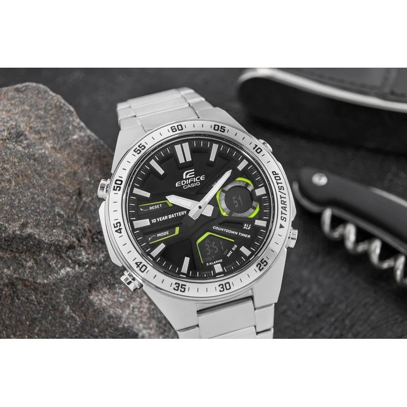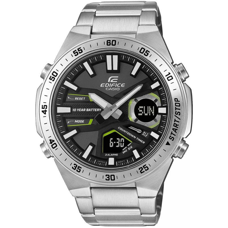 Wszechstronny zegarek dla aktywnych i wymagających. Analogowo-cyfrowy czasomierz EDIFICE EFV-C110 zapewnia precyzję i funkcjonalność na lata – 10-letnia bateria sprawia, że możesz zapomnieć o jej wymianie na długi czas. Dynamiczny, sportowy design podkreśla głębia i trójwymiarowość tarczy, a cyfrowe wyświetlacze oferują szeroki wachlarz funkcji, w tym czas światowy, stoper 1/100 sekundy i minutnik odliczający. Model posiada równieżTelememo z możliwością zapisania 30 numerów telefonów, zawierających do 12 cyfr z nazwą do 8 znaków. Skup się na życiu i wybierz EDIFICE EFV-C110 - zegarek, który Cię nie zawiedzie.