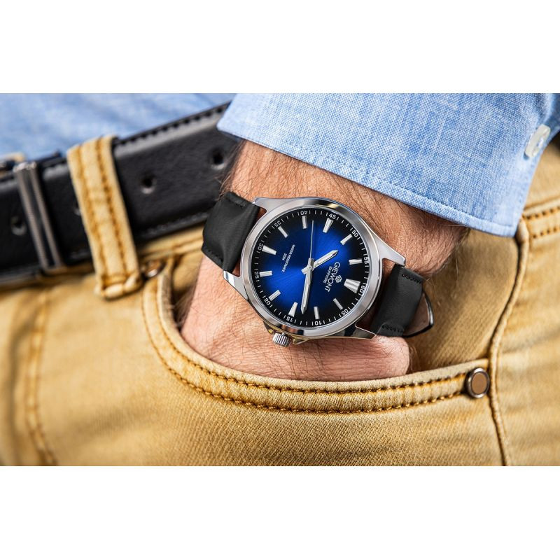 GIEWONT Elegance Sapphire to zegarek stworzony dla mężczyzn, którzy cenią sobie nienaganny styl, dobrą jakość wykonania i detale świadczące o dobrym guście. Jego głęboka, granatowa tarcza o subtelnym, promienistym gradiencie natychmiast przyciąga wzrok i nadaje całości wyjątkowego, prestiżowego charakteru, a odporne na zarysowania szafirowe szkło gwarantuje, że czasomierz zachowa swój nienaganny wygląd przez wiele lat intensywnego użytkowania. Precyzyjne, metaliczne indeksy i smukłe wskazówki zapewniają doskonałą czytelność nawet w trudnych warunkach oświetleniowych, podkreślając jednocześnie elegancki charakter zegarka. Solidna koperta w srebrnym połysku harmonijnie współgra z miękkim, klasycznym skórzanym paskiem, który idealnie dopasowuje się do nadgarstka i sprawia, że noszenie zegarka jest czystą przyjemnością. To uniwersalny, ponadczasowy model, który doskonale sprawdzi się zarówno podczas spotkań biznesowych, formalnych uroczystości, jak i w codziennych stylizacjach, dodając pewności siebie oraz wyrafinowania. GIEWONT Elegance Sapphire to nie tylko stylowy dodatek – to symbol elegancji, dbałości o detale i świadomy wybór mężczyzny, który wie, czego oczekuje od swojego czasu i od swojego stylu.