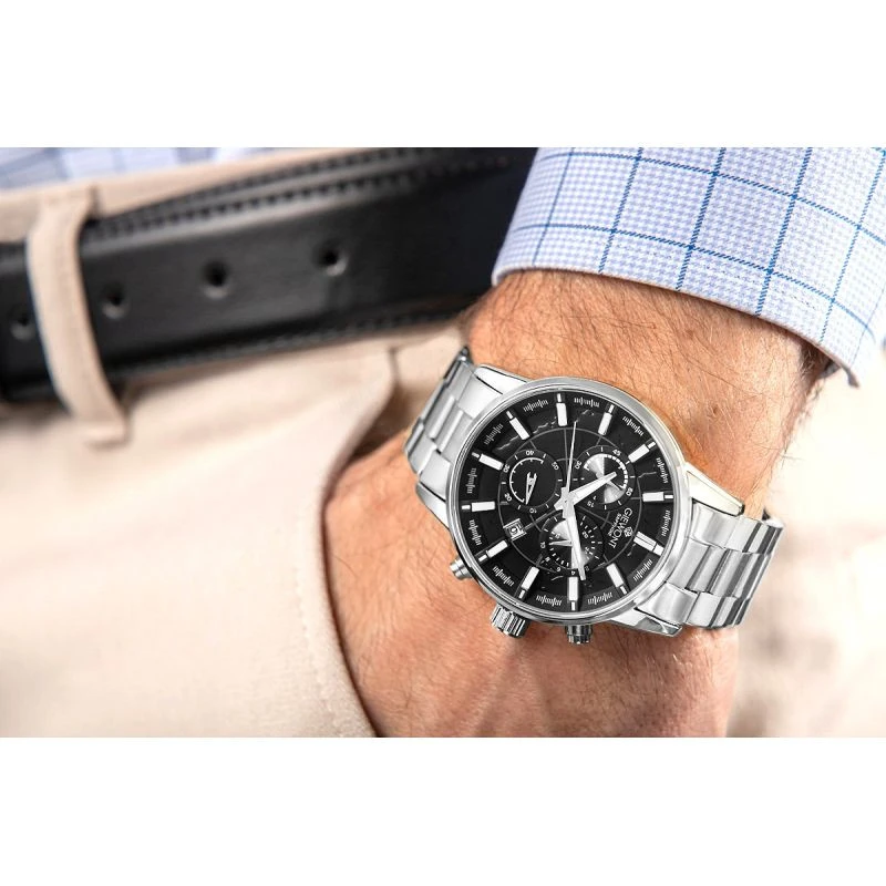 Zegarek męski Giewont GW4580-B2topropozycja dla mężczyzn ceniących nowoczesny design, precyzyjną funkcjonalność i wyrazisty charakter. Jego wielowymiarowa tarcza z subtelnymi tłoczeniami oraz subtarcze przyciągają wzrok i nadaje modelowi głębi oraz wyjątkowej elegancji. Wyraźne metaliczne indeksy i masywne wskazówki zapewniają doskonałą czytelność, a chroniące całość szkiełko szafirowe gwarantuje imponującą odporność na zarysowania i nienaganny wygląd przez lata. Solidna stalowa bransoleta z wyrazistymi ogniwami prezentuje się prestiżowo i nowocześnie, a jej ergonomiczna konstrukcja idealnie dopasowuje się do nadgarstka, zapewniając komfort oraz pewność noszenia. Chronograf dodaje zegarkowi sportowej elegancji i funkcjonalności, czyniąc go idealnym zarówno do codziennego użytkowania, jak i bardziej wymagających aktywności. Obecność datownika zwiększa praktyczność modelu, podkreślając jego użytkowy, a jednocześnie luksusowy charakter. Ten model Giewont to wy
