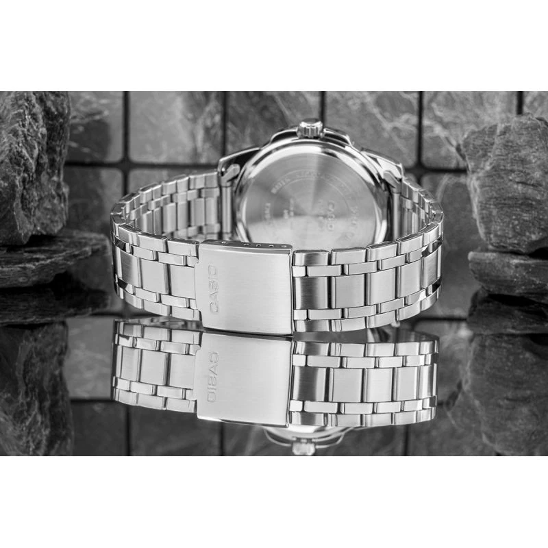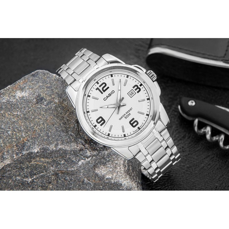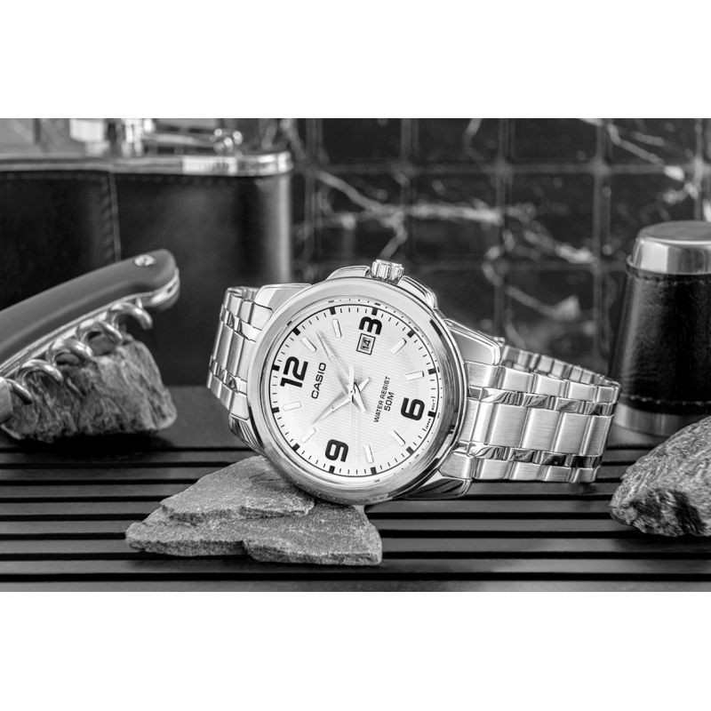 Tyto elegantní pánské hodinky kombinují klasické proporce s moderním zpracováním. světlý, stříbrnobílý ciferník s jemným vertikálním rýhováním dodává celkovému vzhledu svěží a čistý vzhled. velké tmavé arabské číslice na 12, 3, 6 a 9 hodině zaručují dokonalou čitelnost, zatímco štíhlé ručičky a indexy dokonale zapadají do estetiky moderního minimalismu. datumovka na 3 hodině je elegantním doplňkem, který nenarušuje harmonii designu. náramek a pouzdro z kvalitní nerezové oceli zajišťují odolnost a pohodlí při nošení. hodinky jsou vodotěsné do 50 metrů, takže jsou ideální volbou pro každodenní používání - do práce i po práci. hodinky Casio MTP - pro muže, kteří si cení jasných pravidel, čistého designu a spolehlivosti.