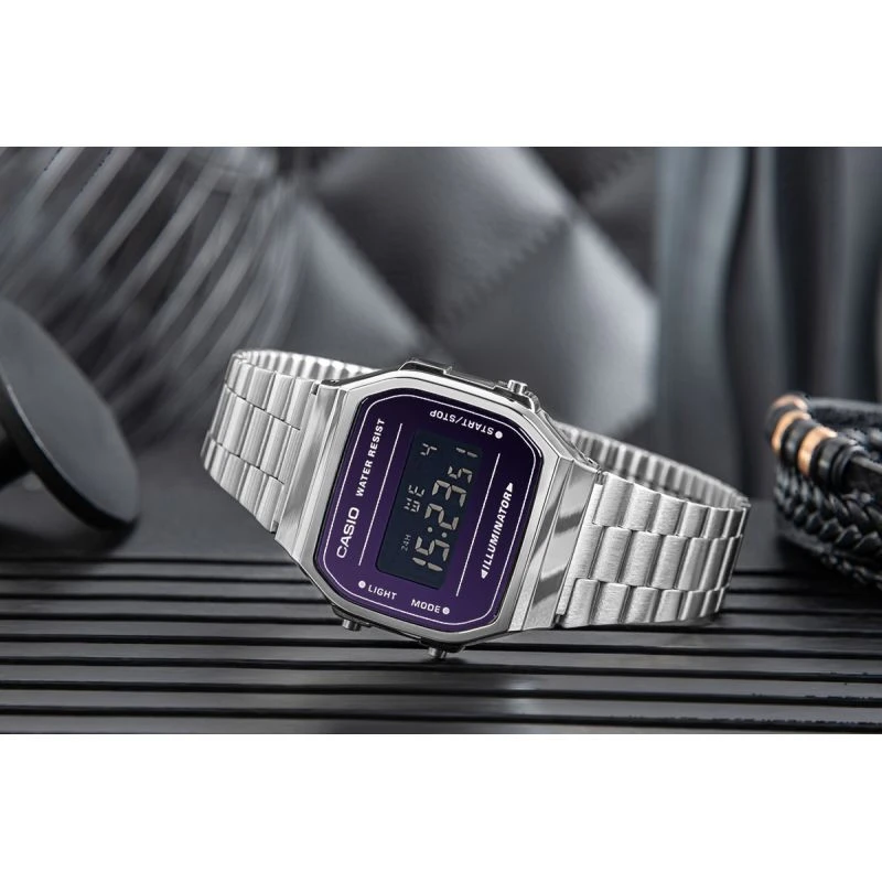 Nie potrzebujesz krzykliwych dodatków, by zwrócić na siebie uwagę. Klasyczna sylwetka Casio spotyka się tu z nowoczesnym wykończeniem – lustrzana tarcza w metalicznym fiolecie przyciąga wzrok, odbijając światło z charakterystycznym połyskiem, który robi wrażenie w każdej sytuacji – od biura po wieczorne wyjście. Model posiadastandardowe wskazanie czasu (cyfrowe): godzina, minuta, sekunda, oznaczenie pory dnia (PM), data, dzień tygodnia. A gdy przychodzi moment działania – ma wszystko, czego trzeba. Stoper 1/100 sekundy, funkcja międzyczasów, codzienny alarm i sygnał godzinowy – praktyczne narzędzia w zgrabnym wydaniu. Wieczorem, gdy światło przygasa, wystarczy jedno naciśnięcie–elektroluminescencyjne podświetlenie w odcieniu niebieskozielonym rozjaśni tarczę i nada jej niepowtarzalnego klimatu. Model posiada również odporność na zachlapania – bo życie nie pyta, czy masz parasol.