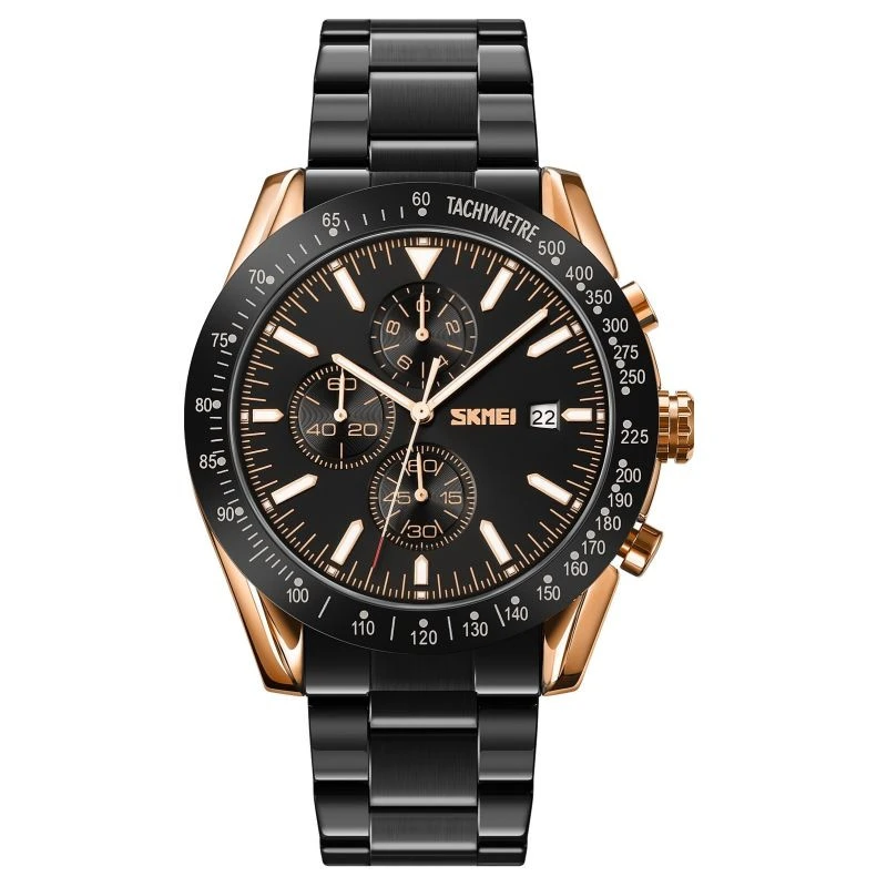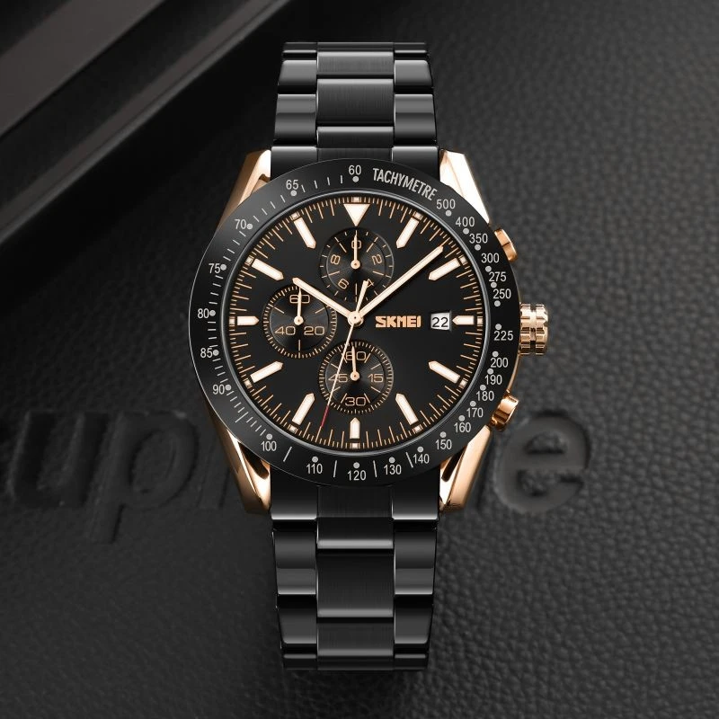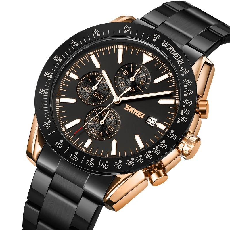 Zegarek Skmei 9253 prezentuje kolorystykę inspirowaną ekskluzywnymi zegarkami klasy premium, co nadaje mu wyjątkowego charakteru. Miedziana koperta i czarna bransoleta przywodzą na myśl luksus i elegancję, idealnie kontrastując z głęboką czernią bezela i tarczy, co jest charakterystyczne dla najlepszych projektów światowych marek. Indeksy i wskazówki, wypełnione fluorescencyjną powłoką, nie tylko podkreślają luksusowy styl zegarka, ale również zapewniają doskonałą widoczność w każdym oświetleniu. Czerwony akcent na sekundniku dodaje mu sportowego charakteru, łącząc elegancję z dynamiką.