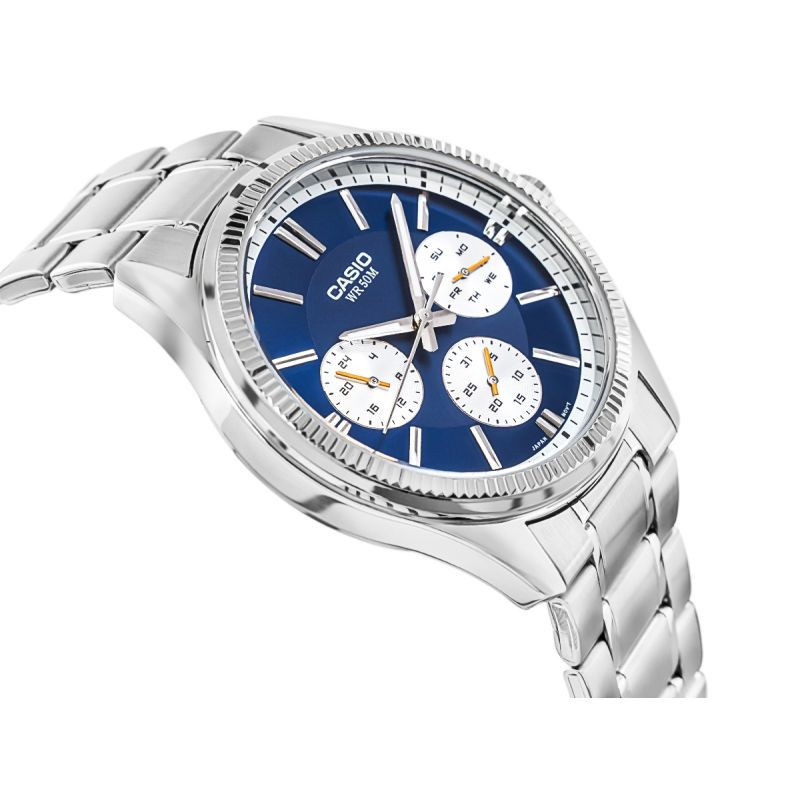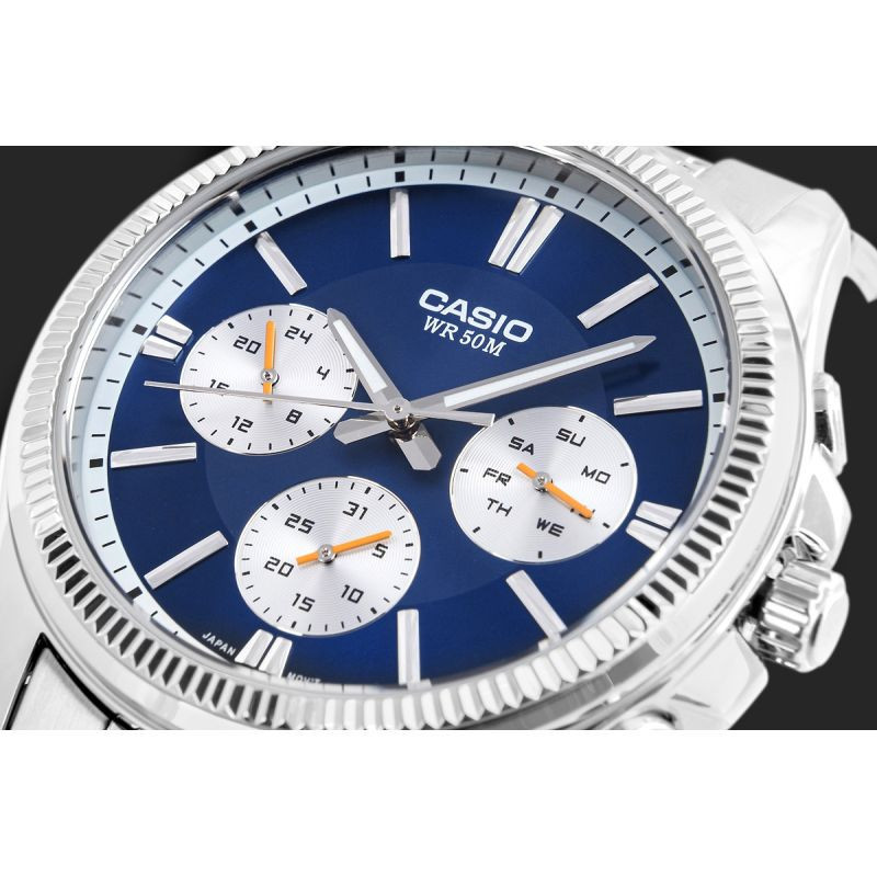 CASIO MTP-1375D-2A1VDF toklasyczny, analogowy zegarek w metalowej oprawie, wzbogacony tarczą w kolorze granatowym. Klasyczna stalowa konstrukcja z powłoką jonową gwarantuje trwałość i odporność na codzienne wyzwania, a eleganckie srebrne detale dodają charakteru każdej stylizacji – od garnituru po jeansy. Subtarcze pokazujące dzień tygodnia, datę i godzinę w trybie 24h dają Ci pełen obraz sytuacji za jednym spojrzeniem, bez sięgania po telefon. Wodoszczelność do 50 metrów i dokładność mechanizmu (±20 sekund/miesiąc) to spokój ducha – nie musisz się martwić o pogodę, przypadkowe zachlapania czy spóźnienia. Całość tworzy wyrazisty, męski styl, który przyciąga spojrzenia i sprawia, że zegarek prezentuje się znacznie powyżej swojej klasy cenowej.