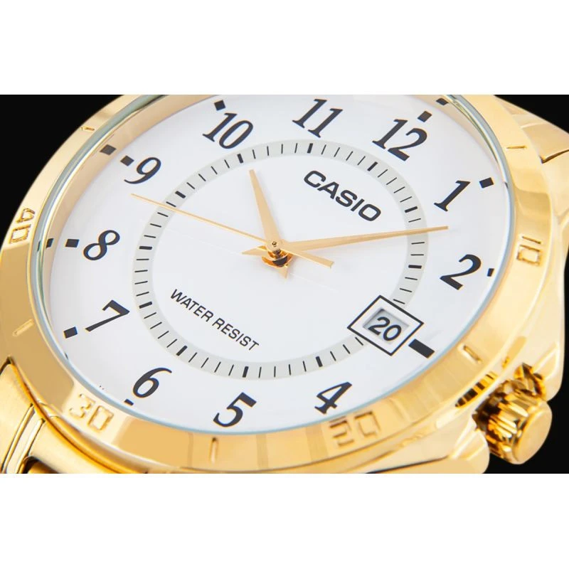 Męski model z kolekcji CASIO, wyróżniający się klasyczną 40-milimetrową kopertą oraz bransoletą ze stali nierdzewnej, pokrytymi trwałą powłoką jonową w kolorze złota. Jasna tarcza z wyraźnymi, czarnymi cyframi arabskimi zapewnia doskonałą czytelność, a dodatkowa skala minutowa w wewnętrznym pierścieniu ułatwia orientację w czasie. Praktyczny datownik zlokalizowany przy godzinie 3 umożliwia szybki wgląd w aktualny dzień miesiąca. Wodoodporność na poziomie WR (Water Resist) sprawia, że zegarek bez obaw można nosić na co dzień – np. podczas mycia rąk czy w deszczową pogodę.Zegarek napędzany jest precyzyjnym mechanizmem kwarcowym, gwarantującym niezawodne działanie.
