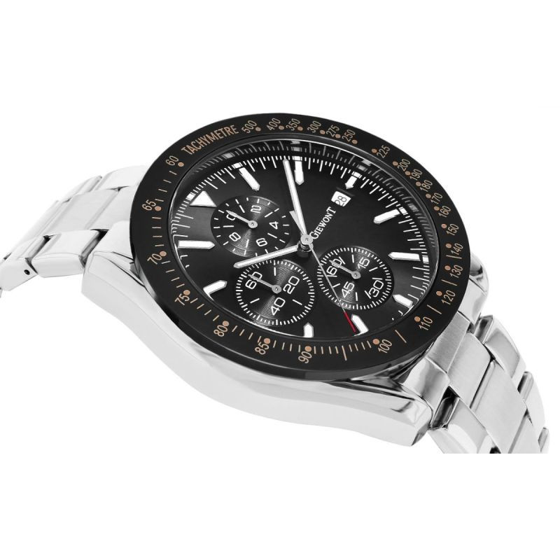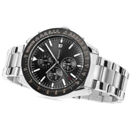 Tarcza: Analogowa z chronografami sekund stopera, minut stopera, trybu czasu 24-godzinnego oraz datownik dni miesiąca