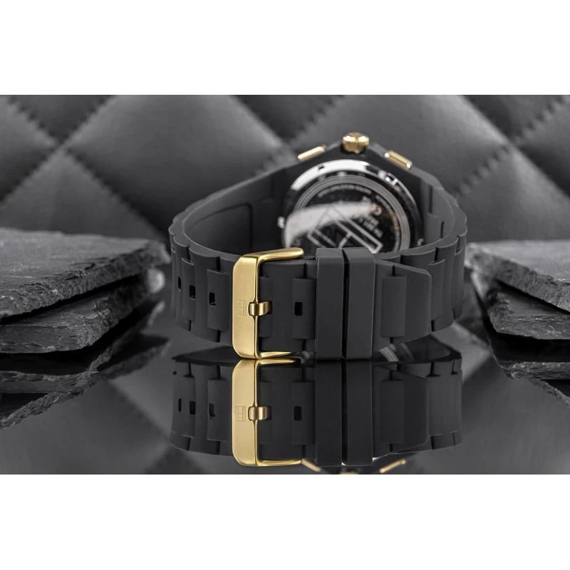 Matowa czerń koperty i paska w idealnej harmonii z luksusowymi, złotymi akcentami na wskazówkach i koronce tworzy elegancję o futurystycznym zacięciu. Charakterystyczny bezel w kształcie dziesięciokąta przełamuje klasykę, nadając zegarkowi unikalnego i dynamicznego wyrazu, a trójwymiarowa tarcza z delikatną fakturą hipnotyzuje swoją głębią. Ucięte wskazówki i subtelne kolorowe detale na subtarczy dopełniają całości, czyniąc ten model prawdziwym manifestem nowoczesnego męskiego stylu i niepowtarzalności. Całość tworzy niepowtarzalne połączenie nowoczesności, precyzji i charakteru – zegarek, który staje się częścią Twojej osobowości.