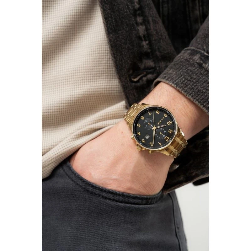 Náramek je vyroben z nejkvalitnější ušlechtilé oceli a kombinuje nezlomnou odolnost s luxusní povrchovou úpravou, která zaujme na první pohled. Jeho silná, robustní konstrukce zaručuje spolehlivost a jistotu, že hodinky budou perfektně ležet, ať už je váš den jakkoli náročný. Precizně provedená spona s vyraženým logem dotváří tento silný, mužný charakter a dodává mu nádech elegance a prestiže. Vícestupňový mechanismus zapínání zabraňuje náhodnému rozepnutí hodinek.
