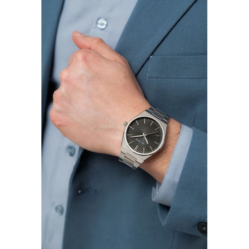 Náramek je vyroben z nejkvalitnější ušlechtilé oceli a kombinuje nezlomnou odolnost s luxusní povrchovou úpravou, která zaujme na první pohled. Jeho silná, robustní konstrukce zaručuje spolehlivost a jistotu, že hodinky budou perfektně ležet, ať už bude váš den jakkoli náročný. Precizně zpracovaná spona s vyraženým logem dotváří tento silný mužský charakter a dodává mu nádech elegance a prestiže. Vícestupňový mechanismus zapínání zabraňuje náhodnému rozepnutí hodinek.