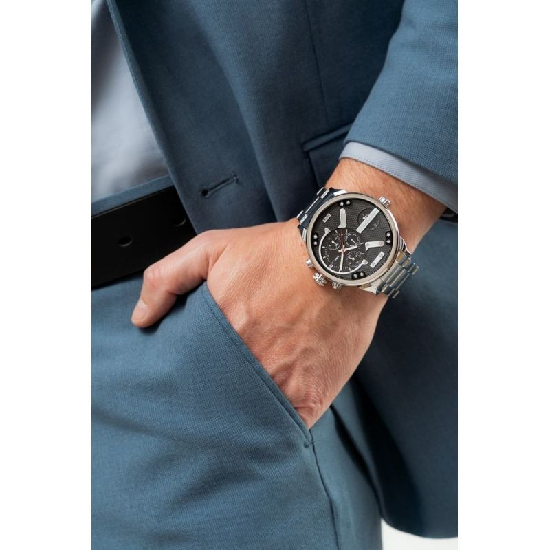 Multifunkčnost dílčích ciferníků tohoto modelu je působivá. Jsou vybaveny systémem duálního času a umožňují sledovat dvě časová pásma současně - ideální pro ty, kteří často cestují nebo pracují v zahraničí. Hlavní ciferník obsahuje tři další ukazatele: den v týdnu, měsíc a čas ve 24hodinovém formátu, což jsou praktické funkce, které usnadňují každodenní organizaci a plánování. Klasická datumovka umístěná na 3. hodině navíc poskytuje rychlý přístup k aktuálnímu datu.