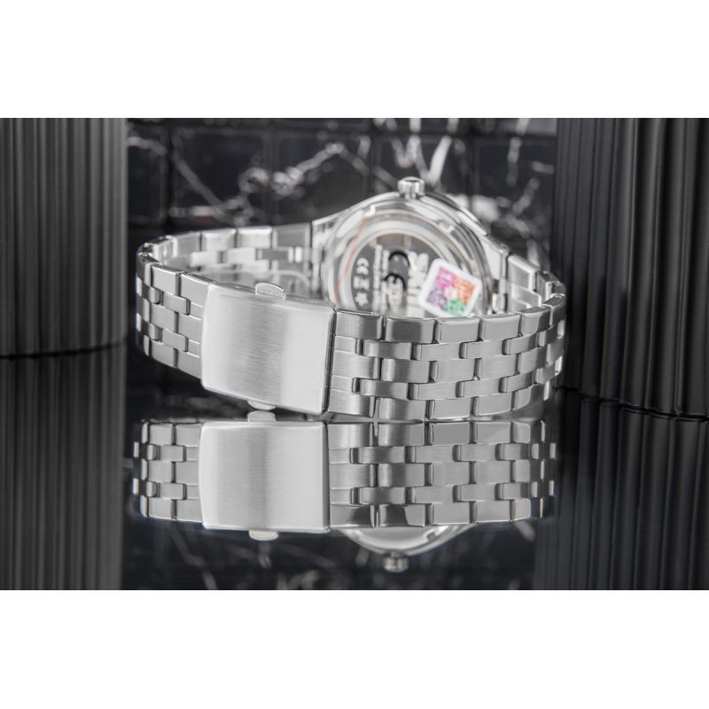 Určitě jste si jich všimli - zelené tečky na ciferníku vytvářejí jemný, ale určitý akcent a podtrhují moderní charakter tohoto modelu. Ostré indexy a precizně navržené ručičky dodávají ciferníku dynamický a mužný vzhled a zároveň zajišťují vynikající čitelnost. Výrazné označení 12 hodin římskými číslicemi dodává hodinkám punc noblesy a odlišuje je od ostatních. Model má fluorescenční ručičky pro rychlé čtení času za zhoršených světelných podmínek, doplněné elegantním pleteným náramkem, který kombinuje matné a lesklé prvky.