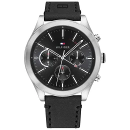 Stříbrné pouzdro obklopuje sytě černý ciferník, kde kontrastní černobílé indexy dodávají hodinkám svěží a moderní vzhled. Stříbrné ručičky a vteřinová ručička s výraznými červenými akcenty přinášejí dynamický nádech, zatímco černý kožený řemínek dokonale dotváří vzhled a vytváří doplněk, který se hodí jak k obleku, tak k běžnému vzhledu. Jemné červené akcenty na subciferníku chronografu dodávají hodinkám Tommy Hilfiger Ashton dynamický, sportovní vzhled. Tyto detaily upoutají pozornost a podtrhují jedinečný design a precizní zpracování.