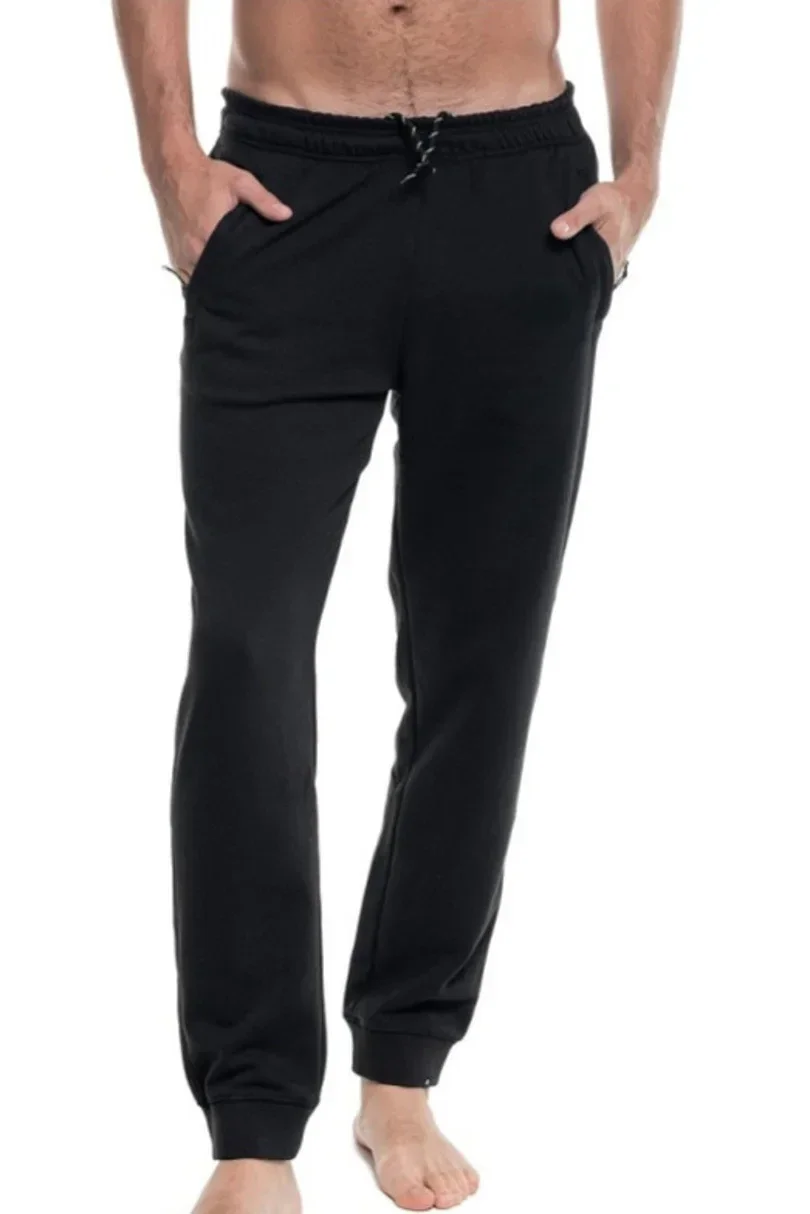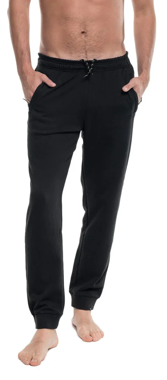 Pánské kalhotky ušité z látky typu french terry. Mají volnější střih, zúžené nohavice zakončené elastickým lemem, pas s regulací a boční kapsy na zip. Gramáž: 270g/m2.