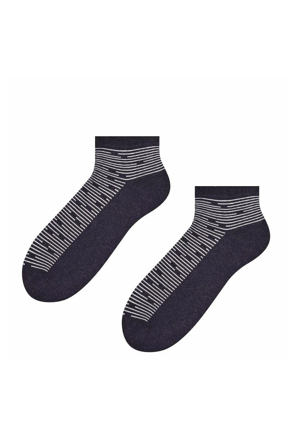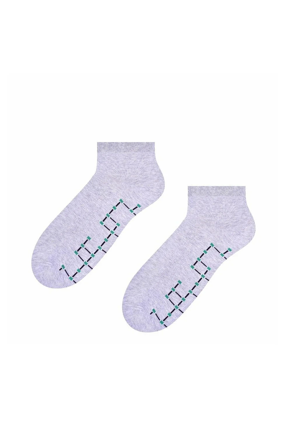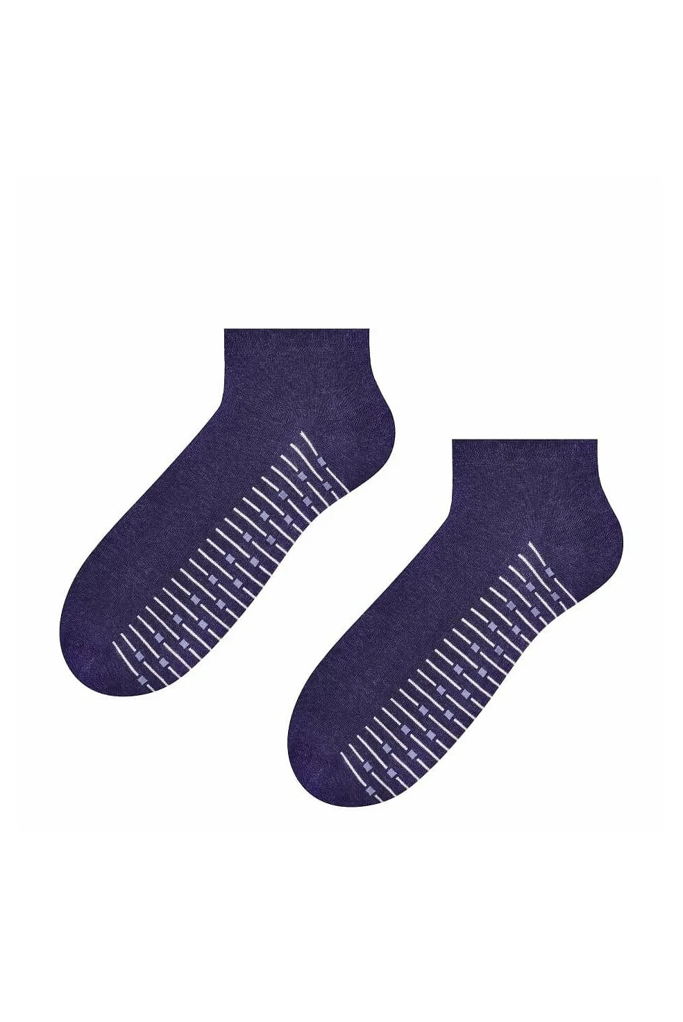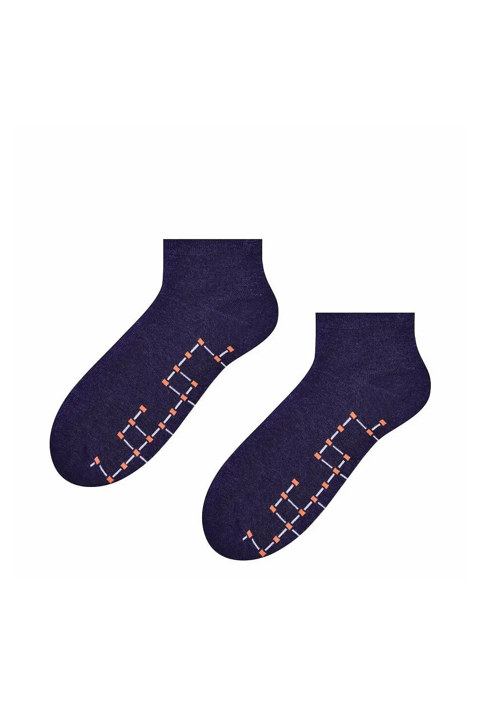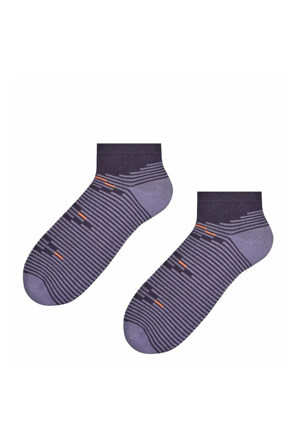 Pánské kotníkové ponožky s přídavkem lycry. Mají ploché švy a nestahující lem. Originální vzor se skvěle hodí ke sportovnímu stylu.