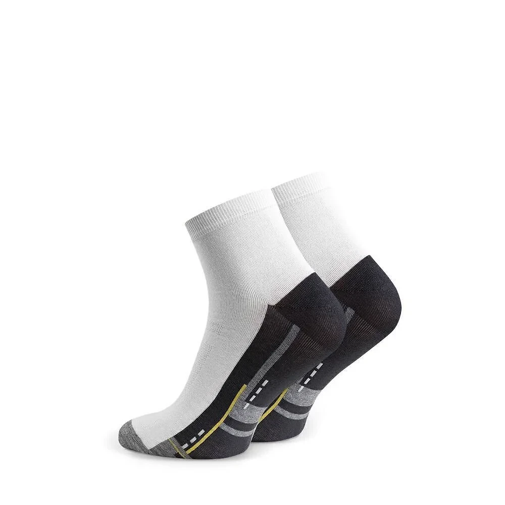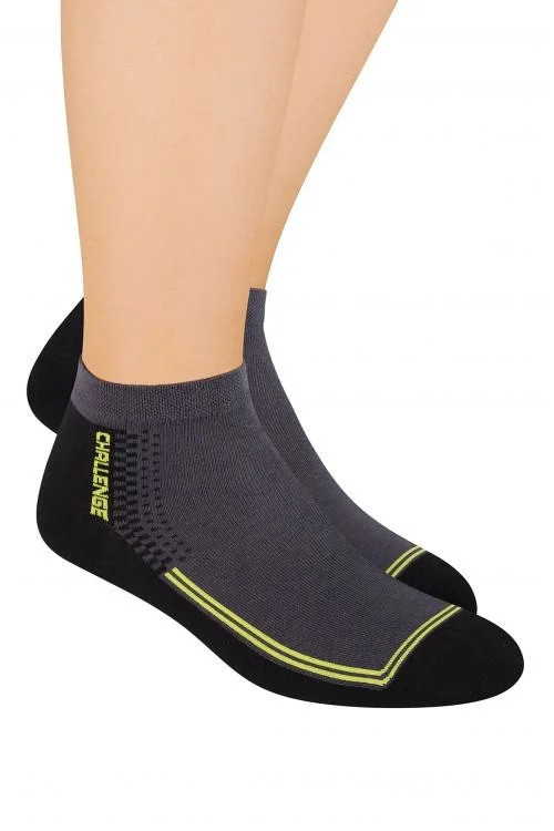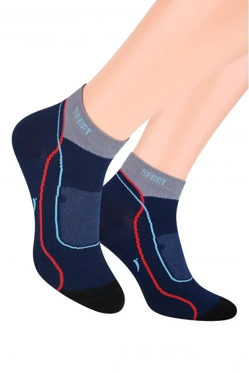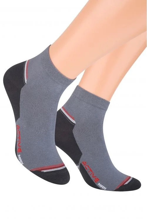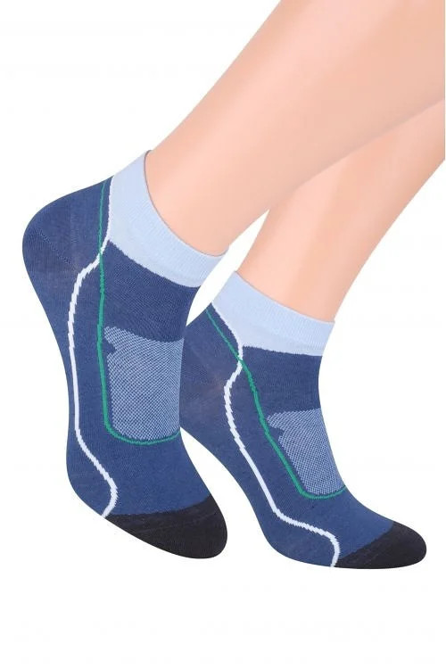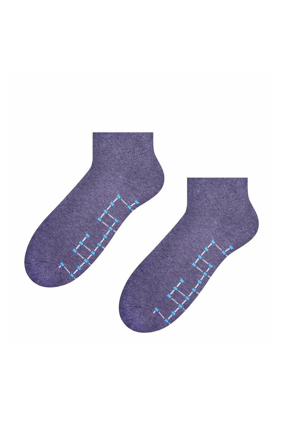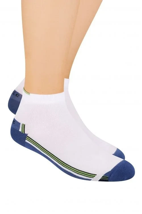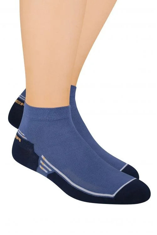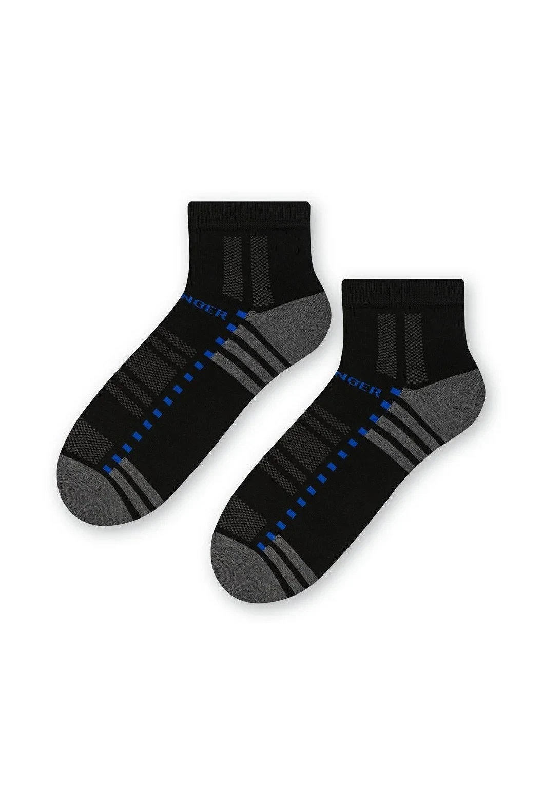 Pánské kotníkové ponožky s přídavkem lycry. Mají ploché švy a nestahující lem. Originální vzor se skvěle hodí ke sportovnímu stylu.