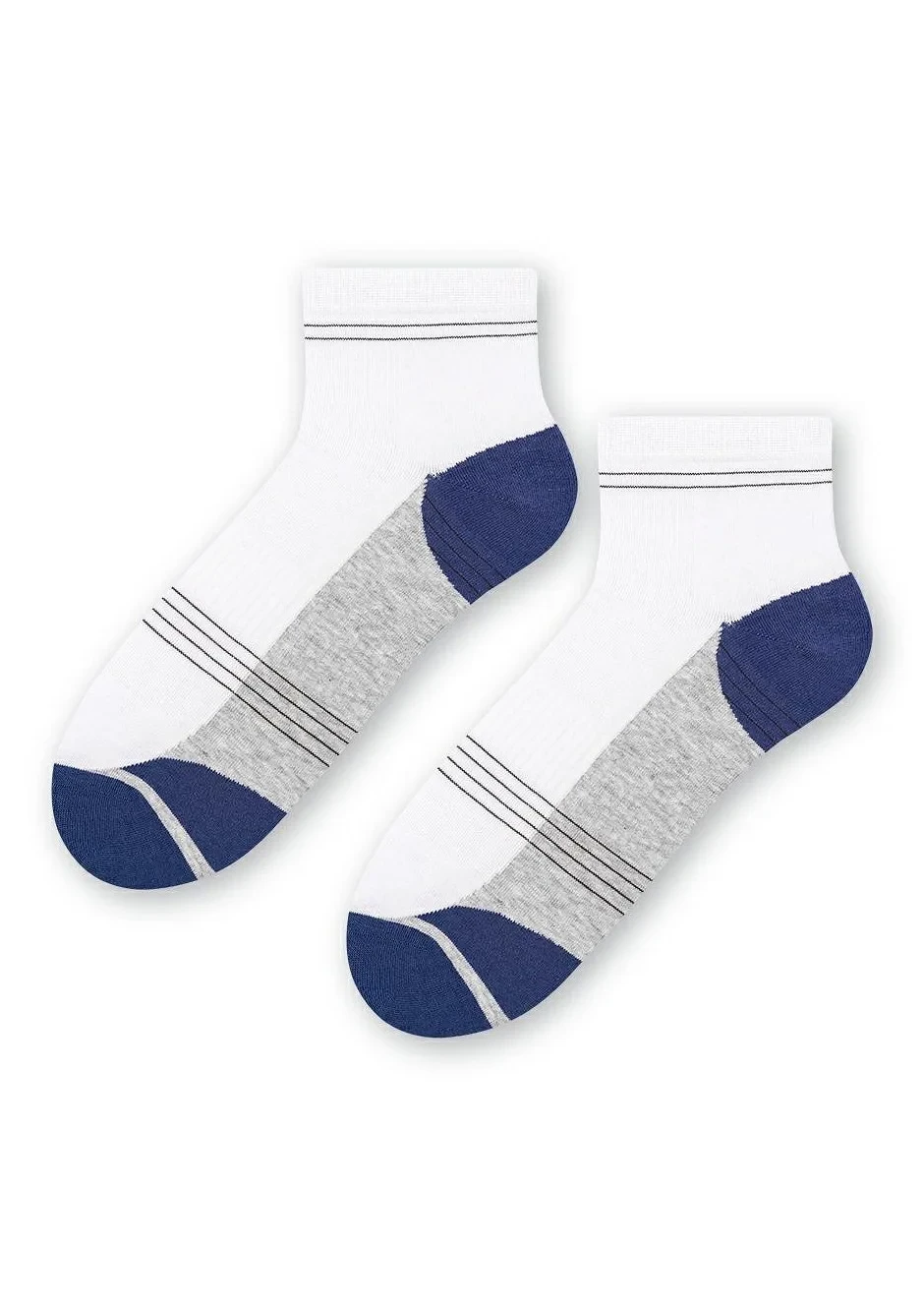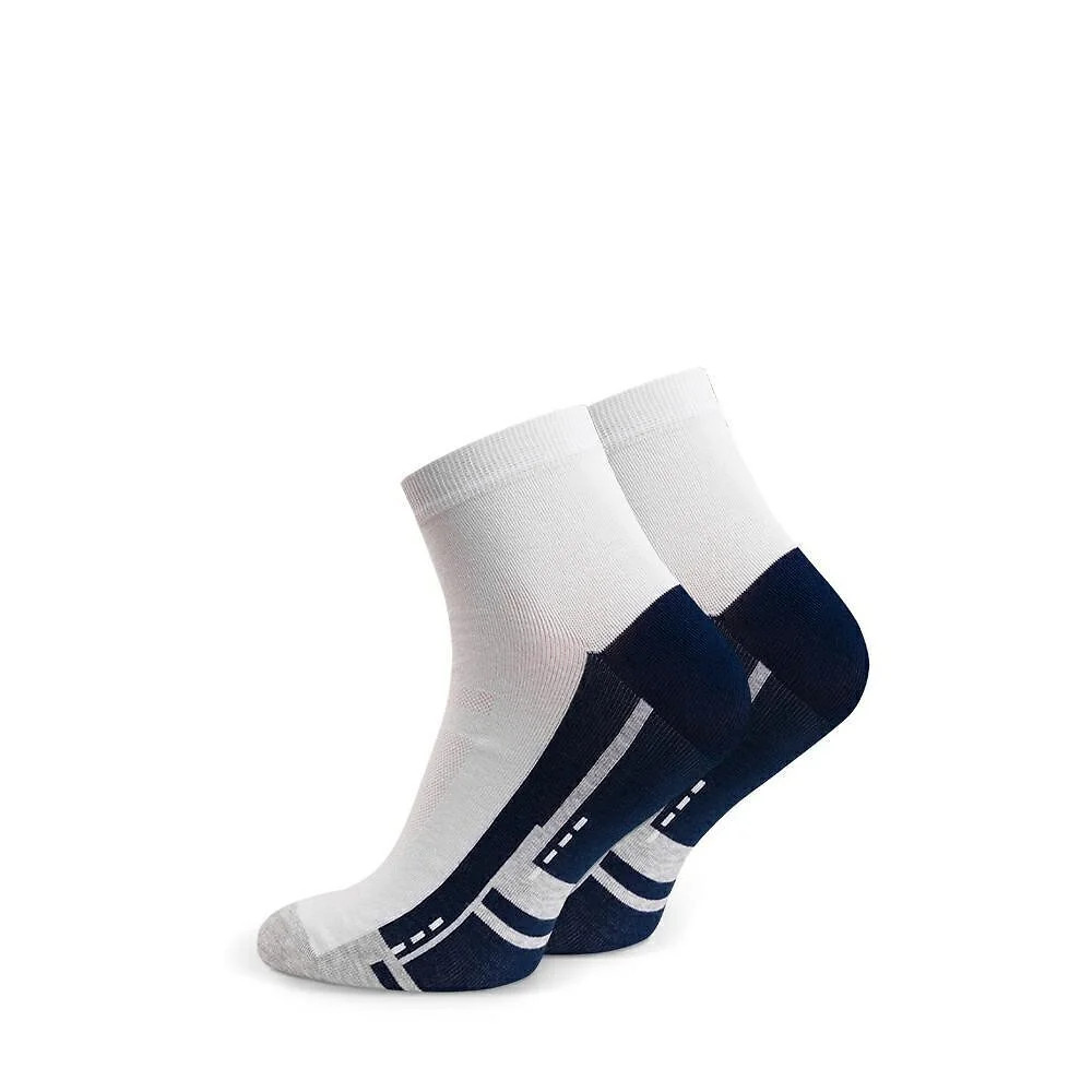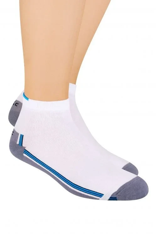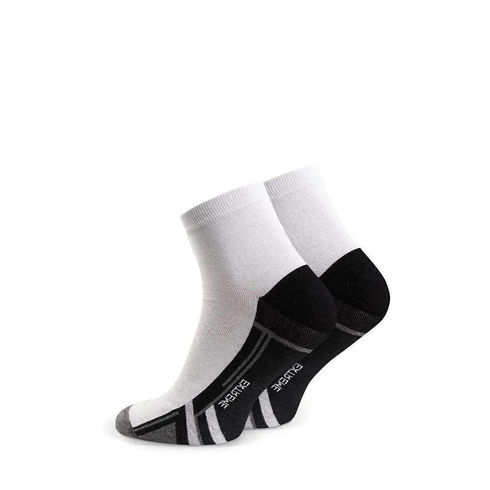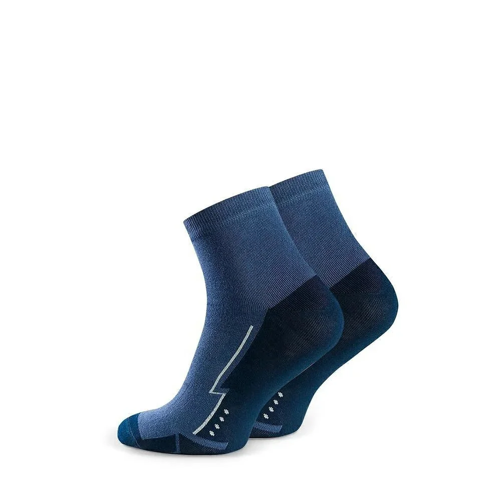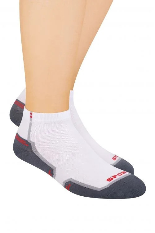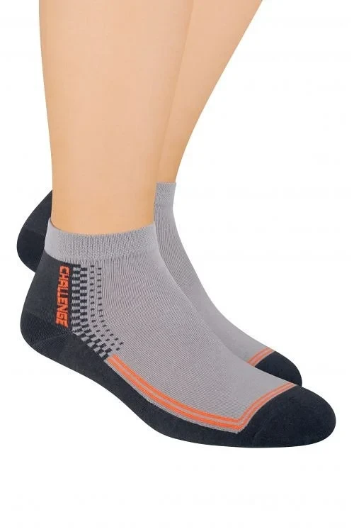 Pánské kotníkové ponožky s přídavkem lycry. Mají ploché švy a nestahující lem. Originální vzor se skvěle hodí ke sportovnímu stylu.