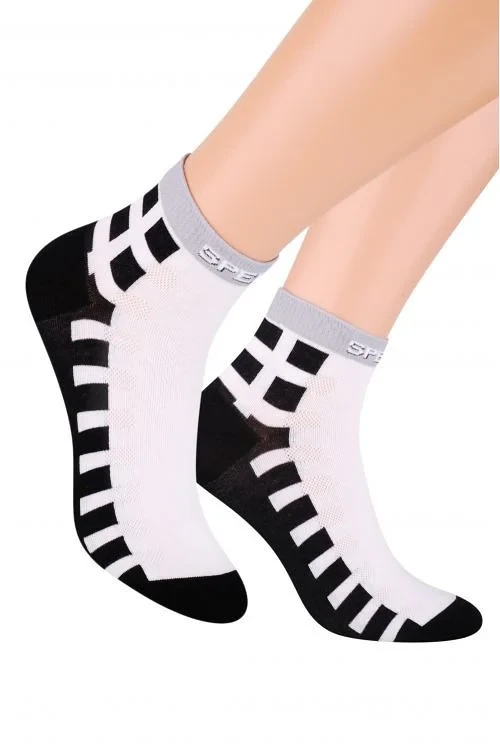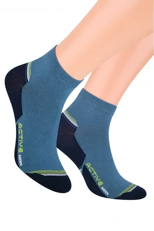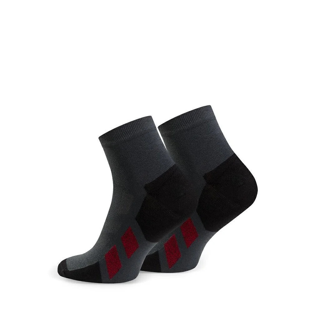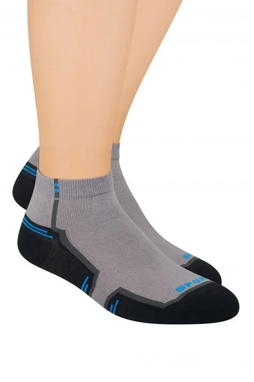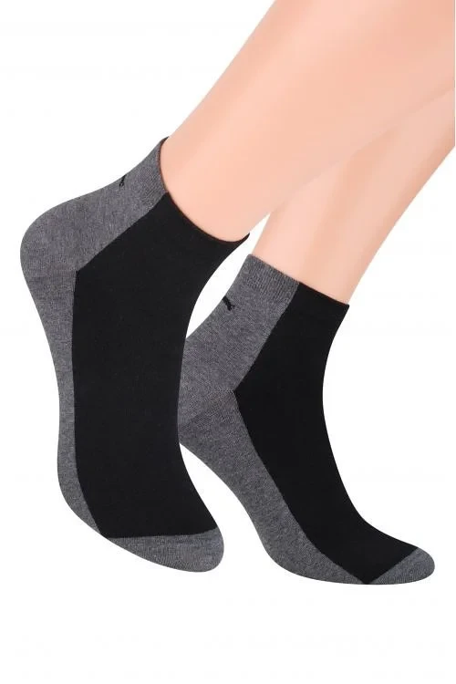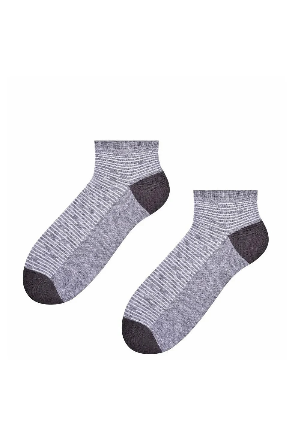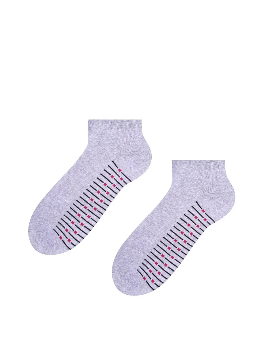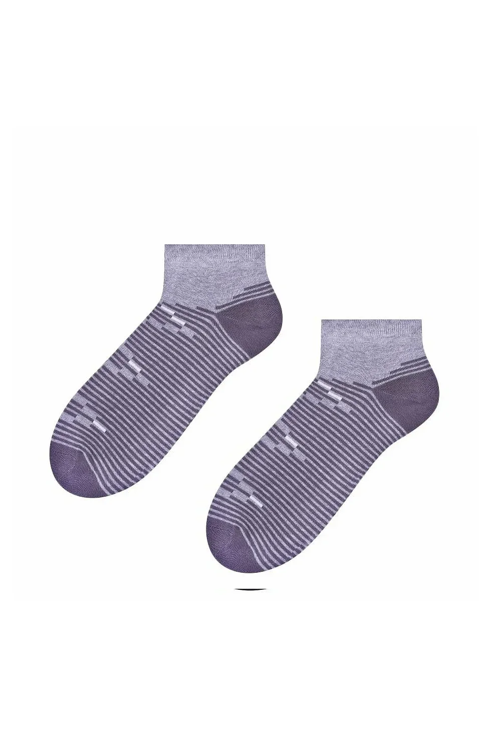 Pánské kotníkové ponožky s přídavkem lycry. Mají ploché švy a nestahující lem. Originální vzor se skvěle hodí ke sportovnímu stylu.
