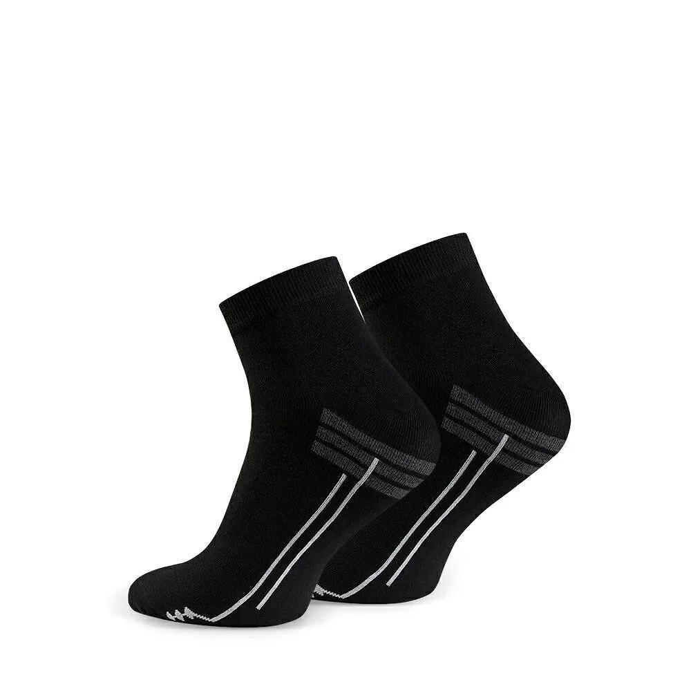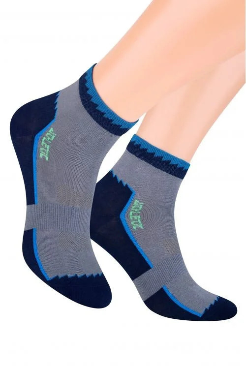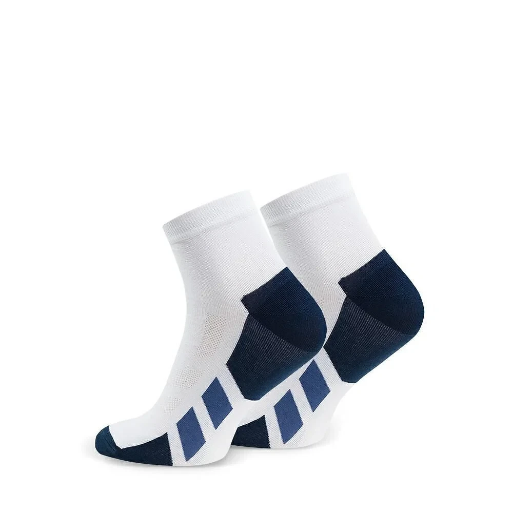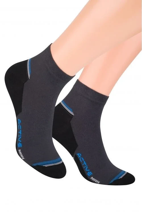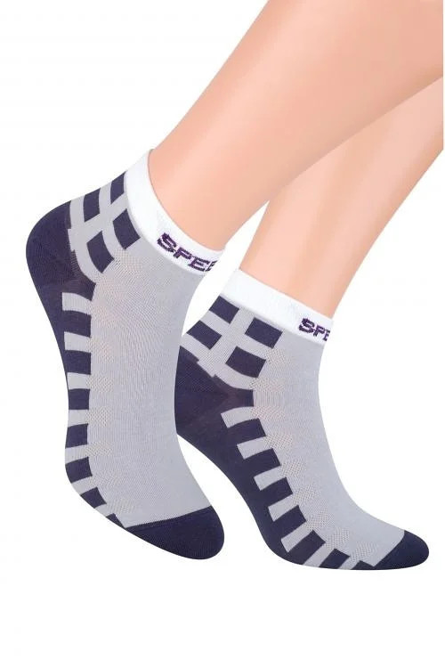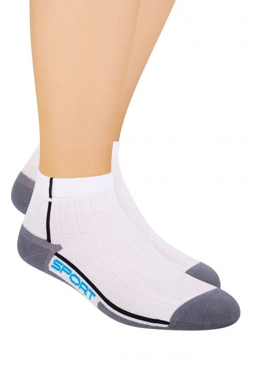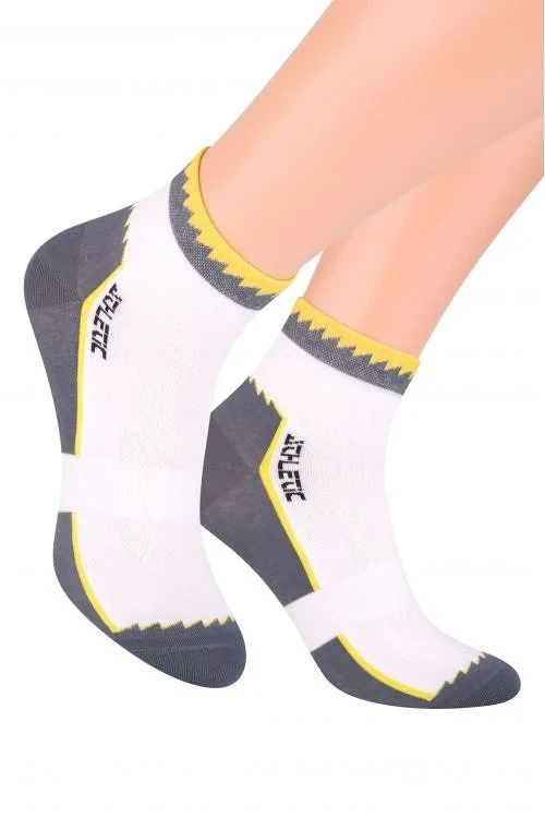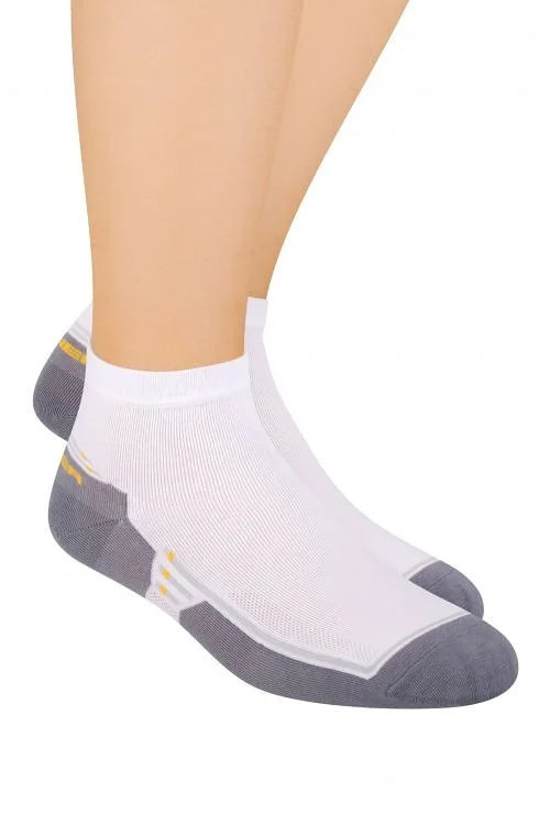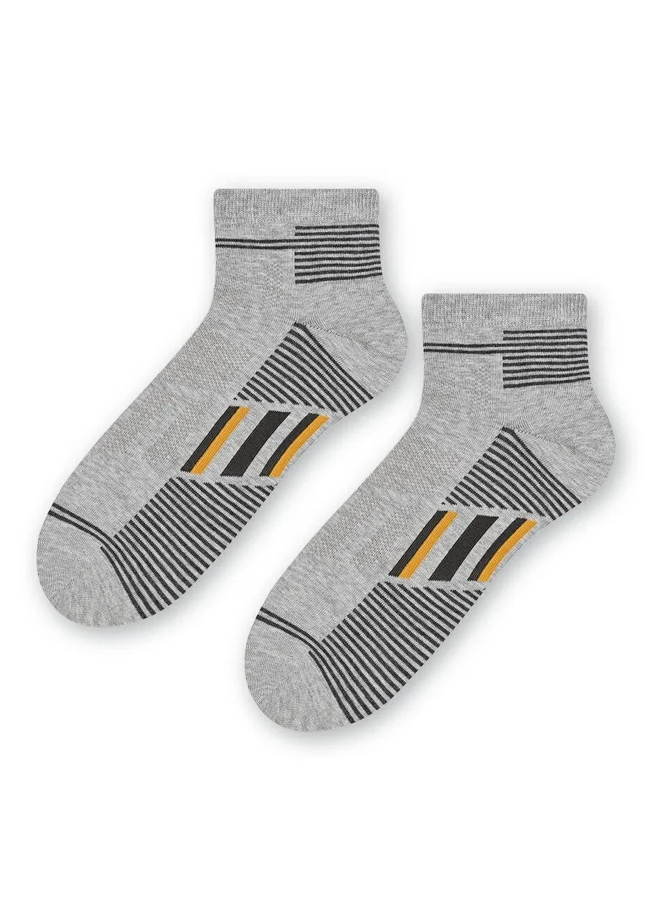 Pánské kotníkové ponožky s přídavkem lycry. Mají ploché švy a nestahující lem. Originální vzor se skvěle hodí ke sportovnímu stylu.