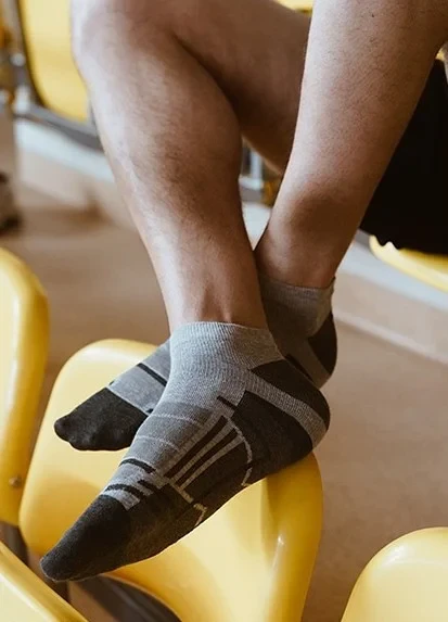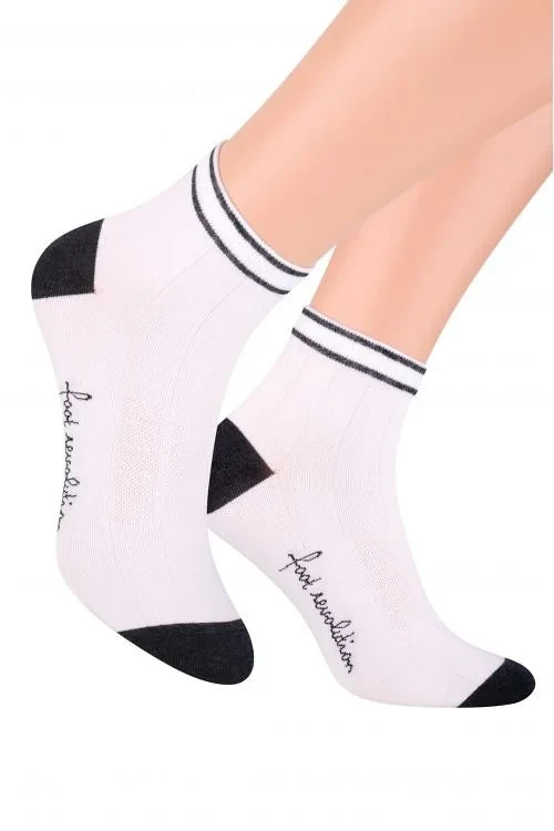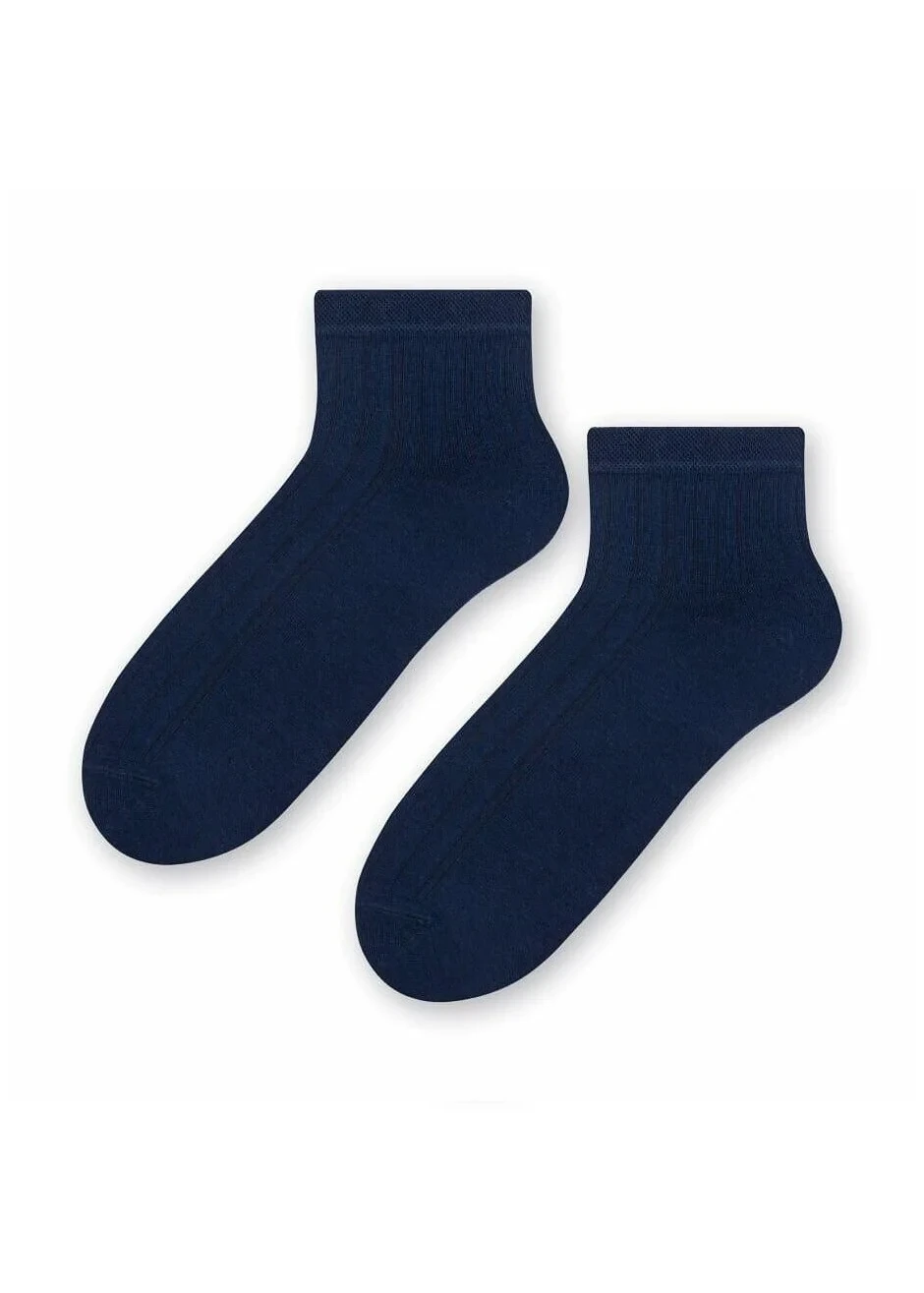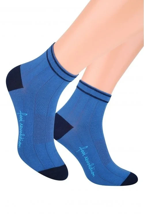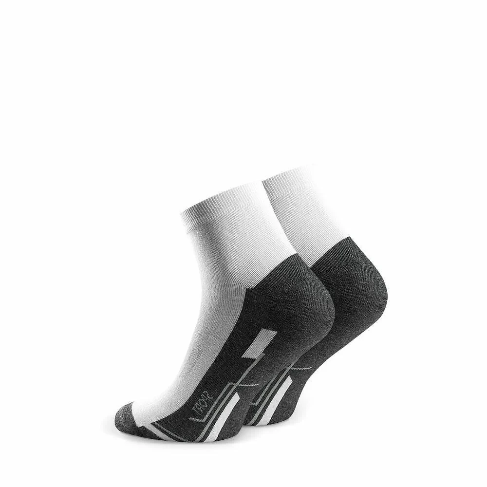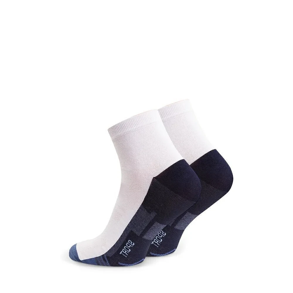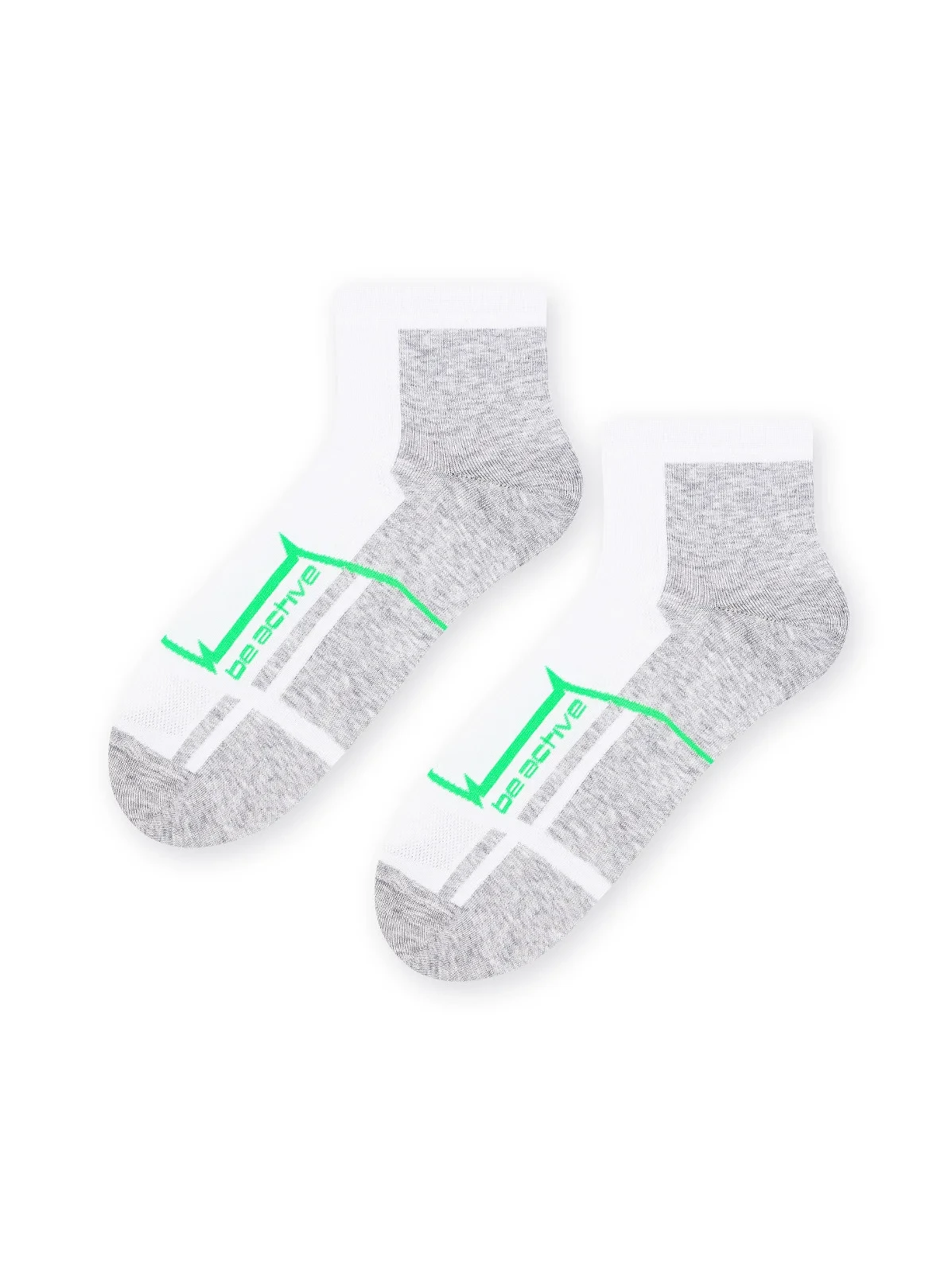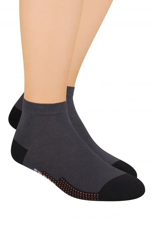 Pánské kotníkové ponožky s přídavkem lycry. Mají ploché švy a nestahující lem. Originální vzor se skvěle hodí ke sportovnímu stylu.