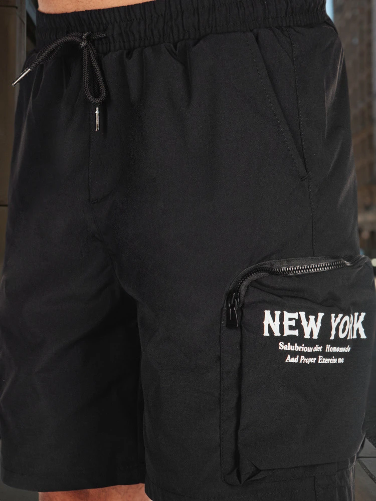 Męskie bojówki materiałowe to idealna propozycja dla fanów wygody i miejskiego stylu. Spodenki mają elastyczny pas ze ściągaczem, co zapewnia dopasowanie do sylwetki. Duże boczne stanowią modny akcent. Nadruk z napisem "NEW YORK" na jednej z bocznych kieszeni. Model świetnie sprawdza się na co dzień, idealny na cieplejsze dni i sezon wiosna–lato.