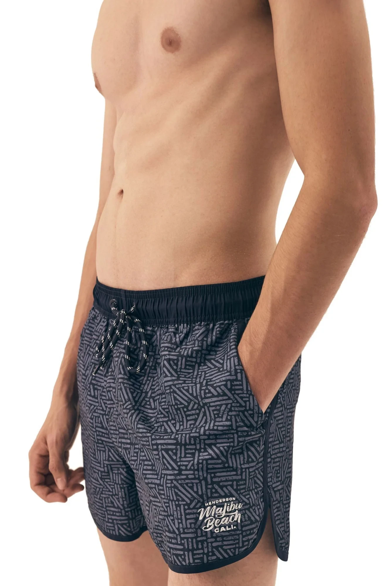 Pánské plavky 42612 Raw HENDERSON - tmavě modrá barva - z velmi kvalitního vzorované materiálu - plavkové šortky jsou neuvěřitelně komfortní - elastický pas se stahovací šňůrkou - zdobené nápisem - z rychleschnoucího materiálu odolného vůči mořské vodě a chlóruMateriálové složení: 100% polyester