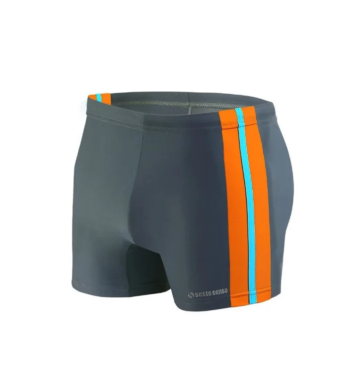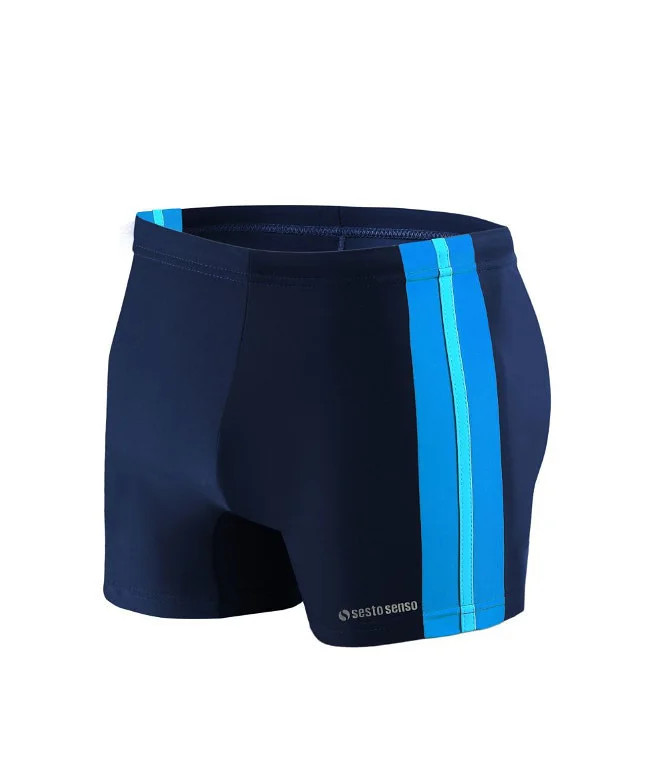 Plavky jsou ozdobené kontrastními boky. V pase je pružná guma a na vnitřní straně šňůrka pro nastavení délky obvodu. Na nohavičce je malý potisk s logem Sesto Senso.