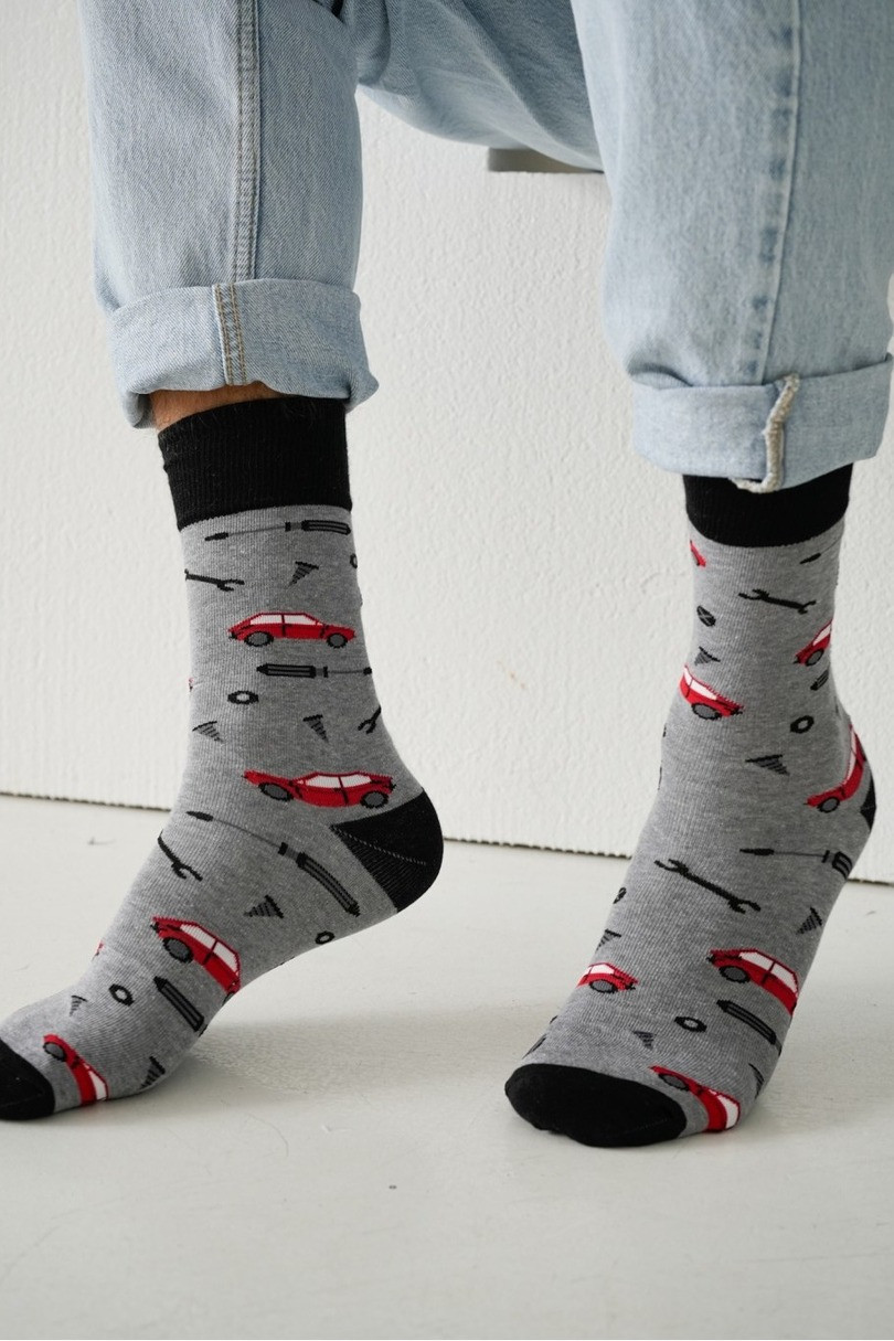 Pánské ponožky Auta a nářadí jsou ideální volbou pro milovníky motorismu a kutilství. Mají originální vzor, který jim dodává charakter a podtrhuje vášeň pro techniku. Jsou vyrobeny z měkké, prodyšné bavlny a zaručují pohodlí po celý den. Díky pružné struktuře se dokonale přizpůsobí noze a zachovají si svůj tvar i po mnoha vypráních. Jsou skvělým nápadem na dárek pro každého fanouška aut a dílenské atmosféry.