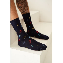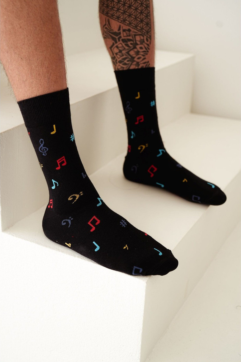 Hudba, hraje! Tyto ponožky s jedinečným motivem not jsou ideální volbou pro každého, kdo miluje hudbu každý den. Výrazný design přitahuje pozornost a podtrhuje individuální styl – ať už jste hudebník, milovník hudby, nebo máte jen rádi originální doplňky. Na jejich výrobu jsme použili pouze tu nejkvalitnější bavlnu, která zajišťuje vynikající prodyšnost, měkkost a pohodlí. Ponožky dokonale přiléhají k noze a zaručují plnou volnost pohybu a pohodlí po celý den.